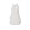 Abito corto e aderente dalla silhouette a sacchetto, caratterizzato da una linea morbida e fluida che crea un effetto scivolato e dinamico. Realizzato in georgette e interamente ricamato a mano, l'abito è decorato con ciuffi di piume fissati con micro corallini, mentre l'intero capo è tempestato di piccole perle e canottiglie tono su tono, conferendo un effetto luminoso e tridimensionale.