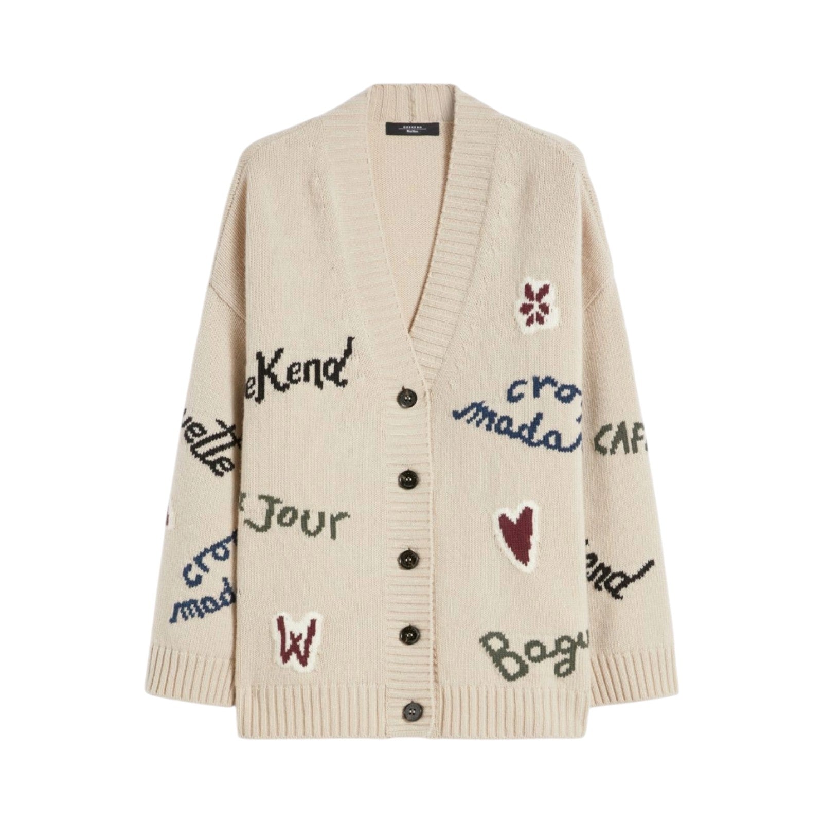 Cardigan in filato di pura lana. Scollo a V. Maniche lunghe a giro basso. Chiusura frontale con bottoni. Bordi rifiniti a coste.