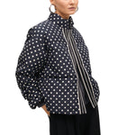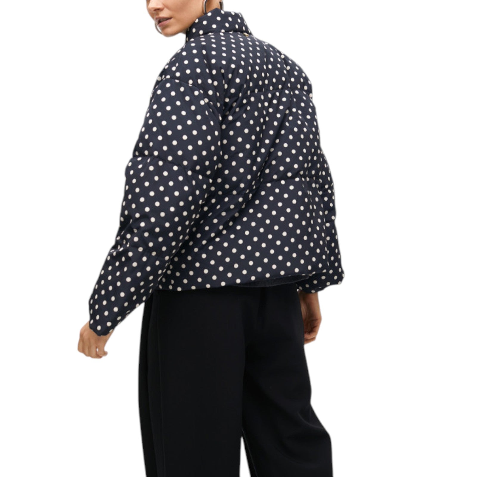 Anorak corto imbottito con design a pois su sfondo blu navy. Dotato di zip frontale e collo alto per un maggiore comfort. Materiale leggero e caldo, ideale per le stagioni di transizione. Polsini elastici per una vestibilità confortevole.