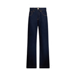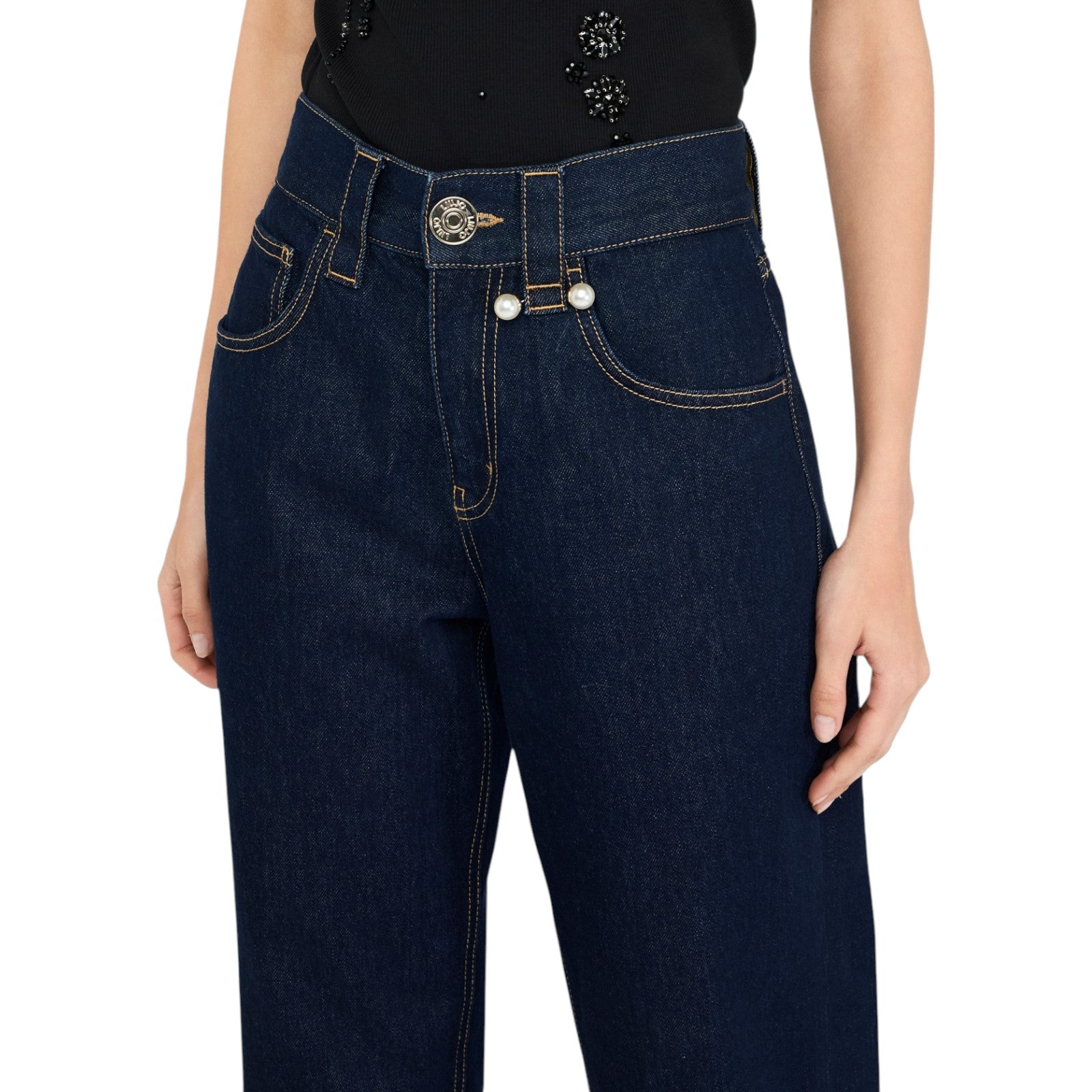 Jeans in denim di cotone. Modello cinque tasche. Vita alta. Gamba dritta. Perle applicate. Chiusura con bottone e zip nascosta.