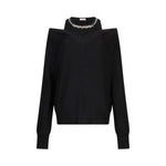 Maglia nera con filati in misto lana. Scollo a V. Inserto ton sur ton con ricami gioiello. Maniche lunghe.