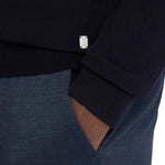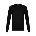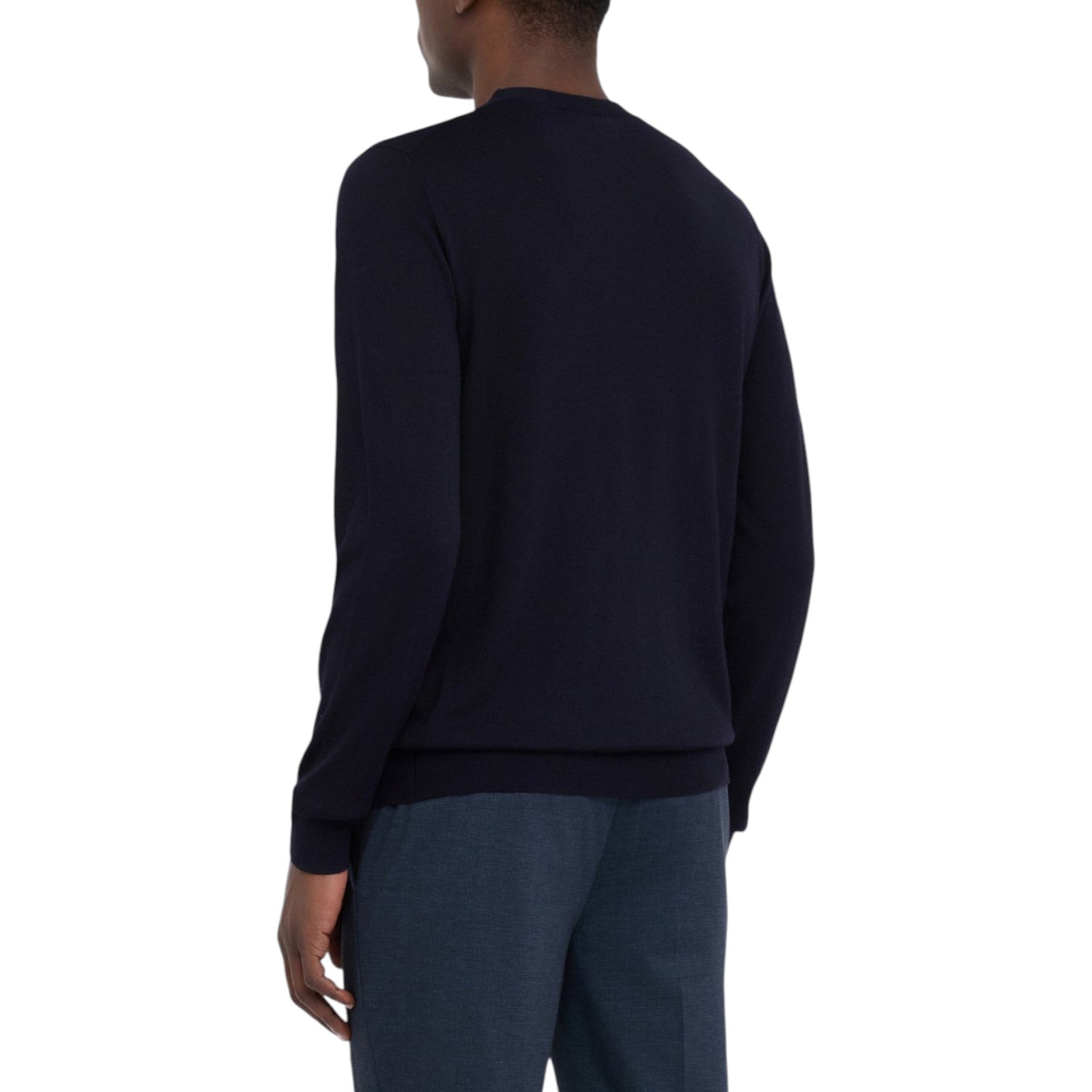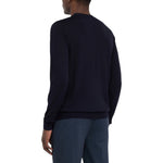 Maglia blu. Realizzata in lana merino. Scollo a V. Maniche lunghe. Bordi a costine. Logo LJ al fondo.