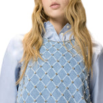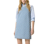 Abito corto smanicato caratterizzato da collo tondo con apertura sul retro e da una silhouette dritta che richiama lo stile dei vestiti anni Sessanta. Il modello punta su un contemporaneo gioco di contrasti, come solo PINKO sa fare: il minimalismo del design si combina infatti con un tessuto denim laserato su cui spicca un disegno a rombi leggermente a contrasto, arricchito da luminosi strass ricamati a mano.
