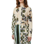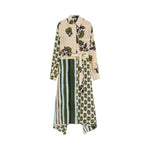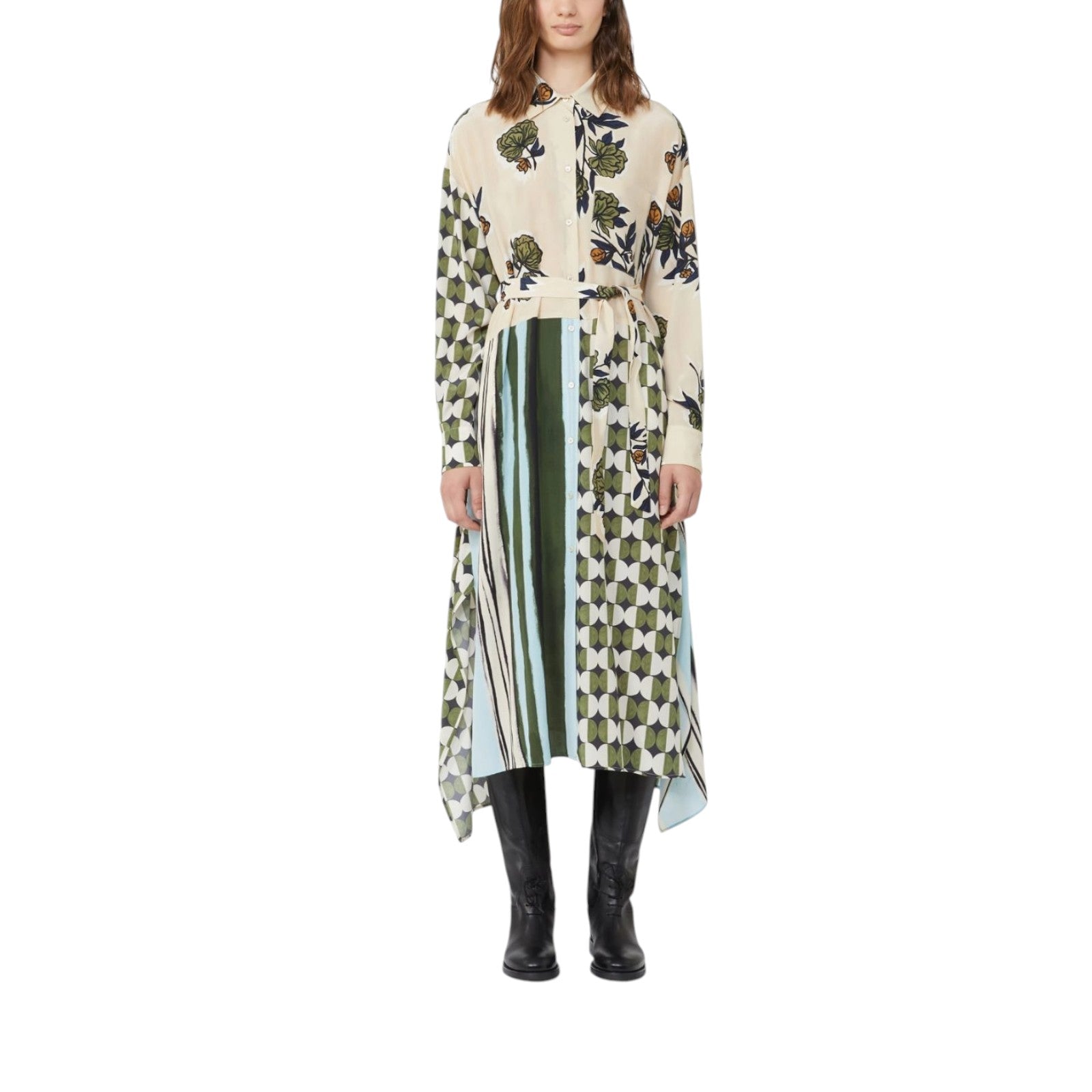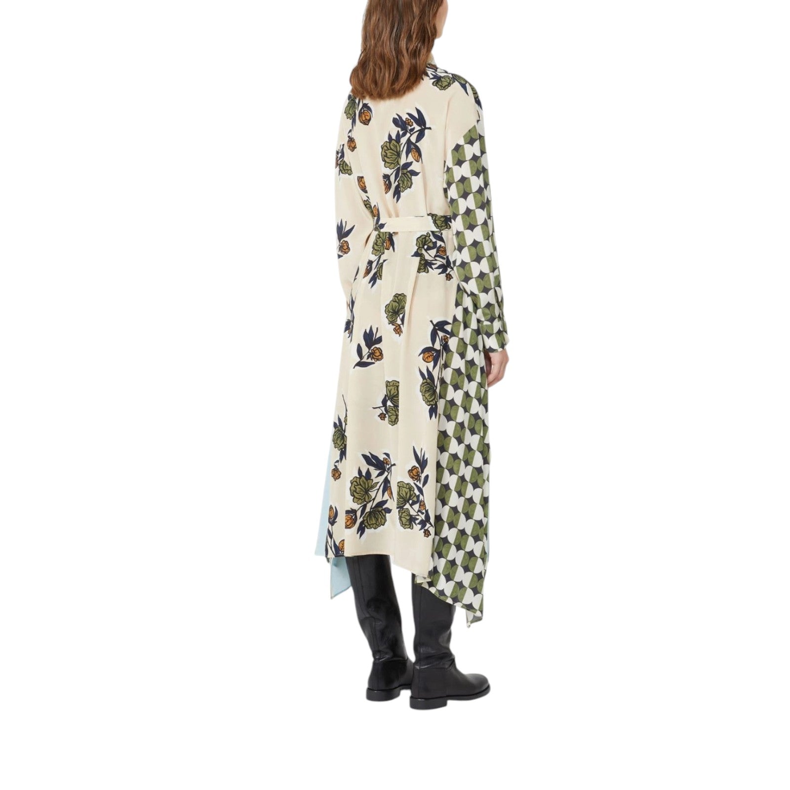 Abito in crêpe de Chine di pura seta. Vestibilità ampia. Colletto e polsini a camicia. Chiusura frontale con bottoni su tutta la lunghezza. Taschino sul petto e tasche inserite nei fianchi. Fondo asimmetrico. Sfoderato.
