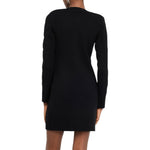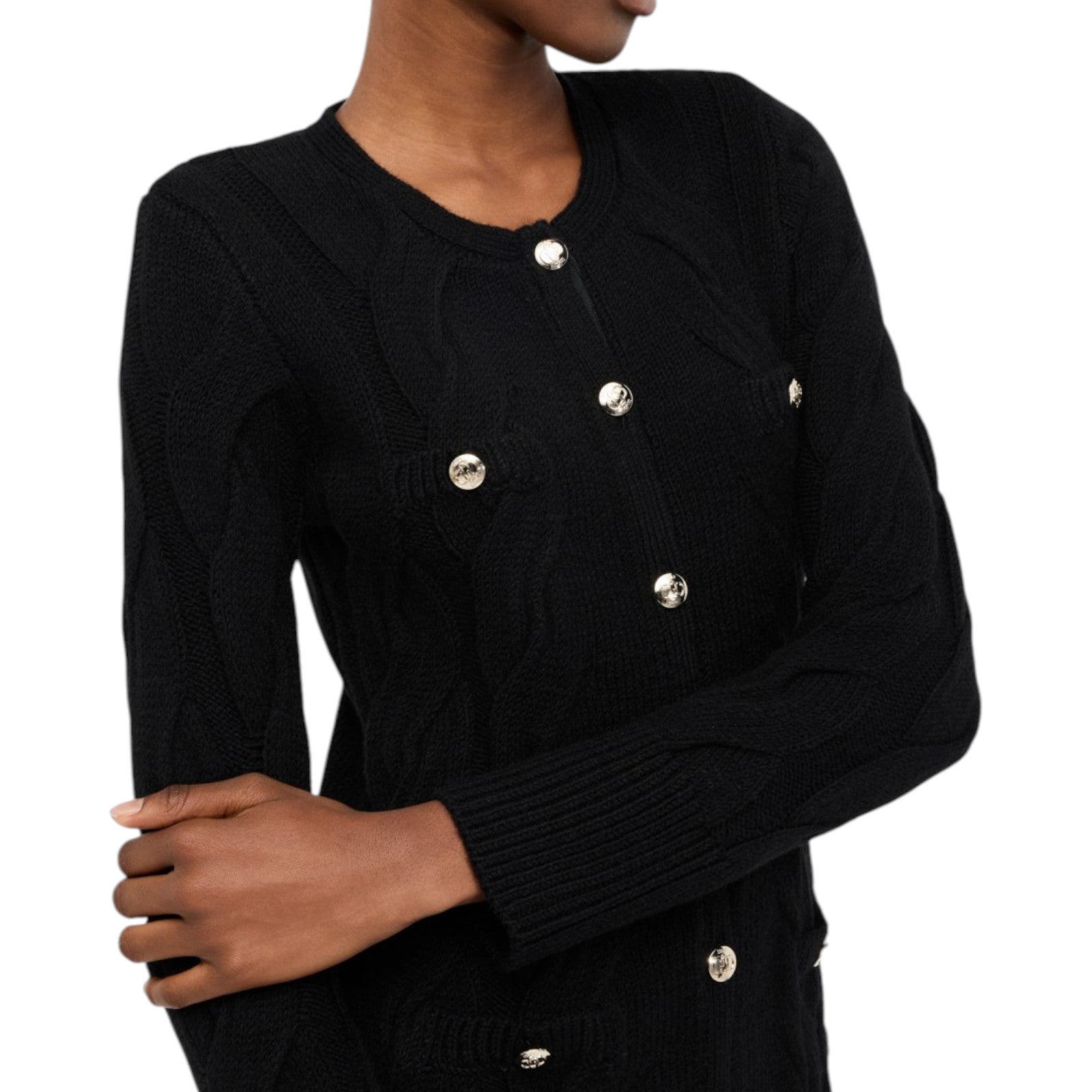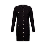 Abito corto nero. Realizzato in maglia di misto lana. Lavorazione a trecce. Scollo rotondo. Maniche lunghe. Taschini e tasche con bottone dorato. Bordi a coste. Chiusura con bottoni dorati logati. La modella è alta 178 cm e indossa la taglia S.