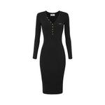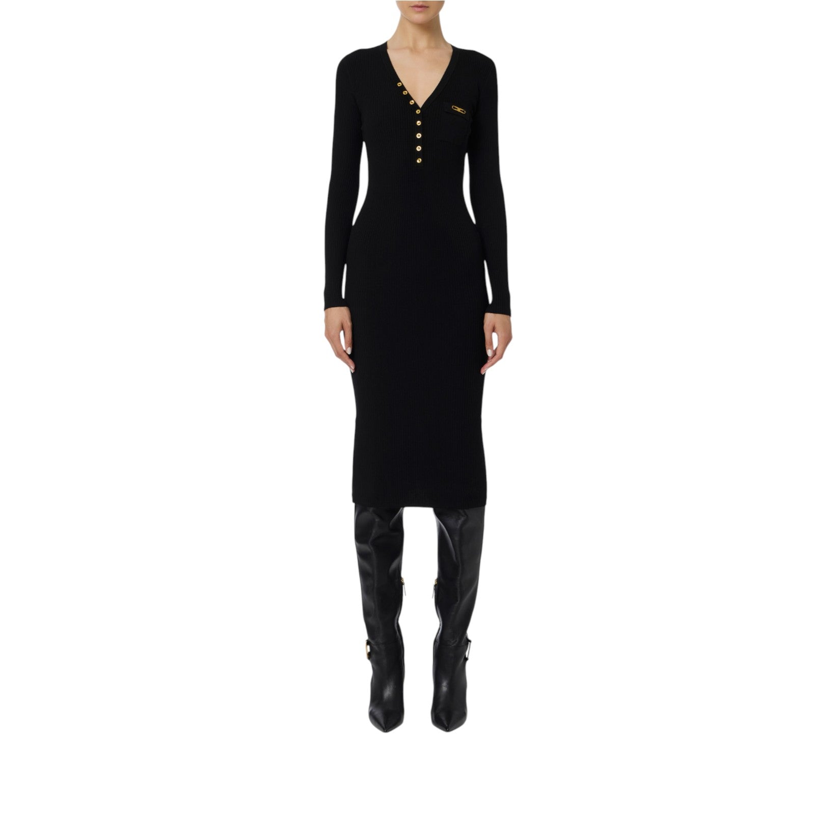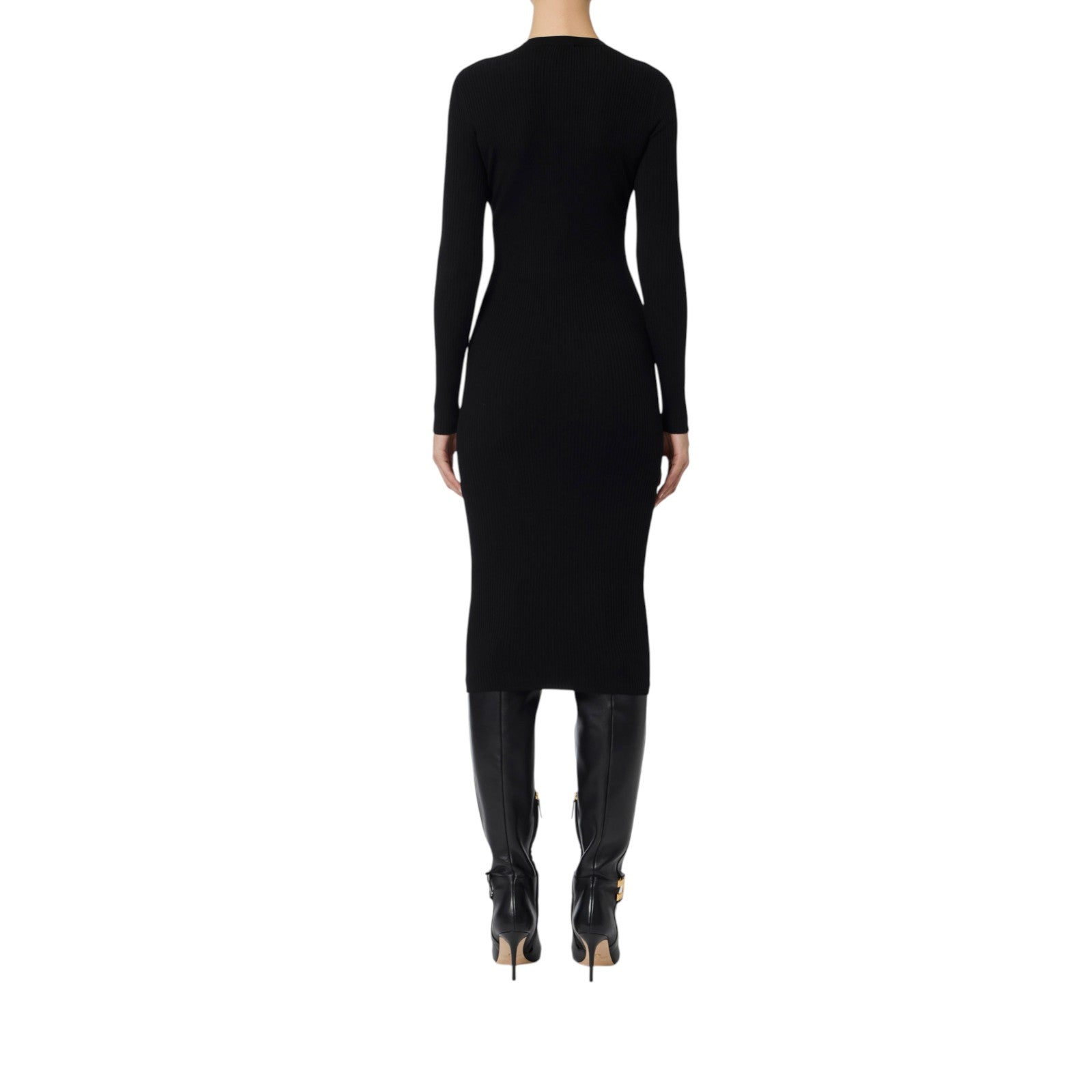 Abito a tubino in maglia dalla vestibilità aderente. Il vestito ha scollo a V con bottoni, maniche lunghe, gonna longuette. Si distingue per l'elaborata lavorazione a costine che crea un mix di definizione e morbidezza. Il taschino in raso con logo in metallo dorato completa il capo.