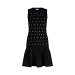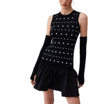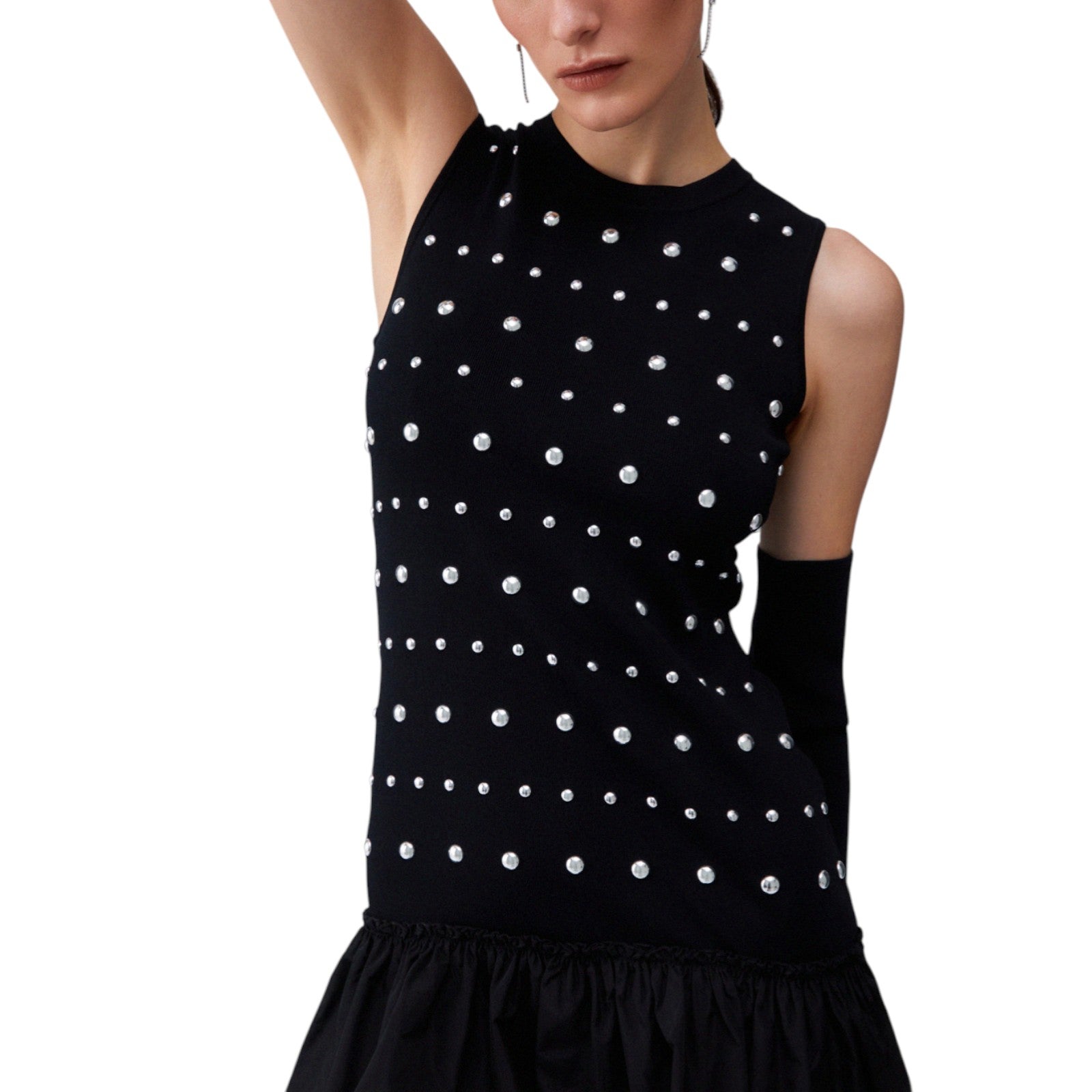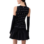 Abito corto in maglia. Filati in misto viscosa. Borchie applicate. Girocollo. Volant sul fondo. Manicotti con foro per il pollice. La modella è alta 180 cm e indossa la taglia S.