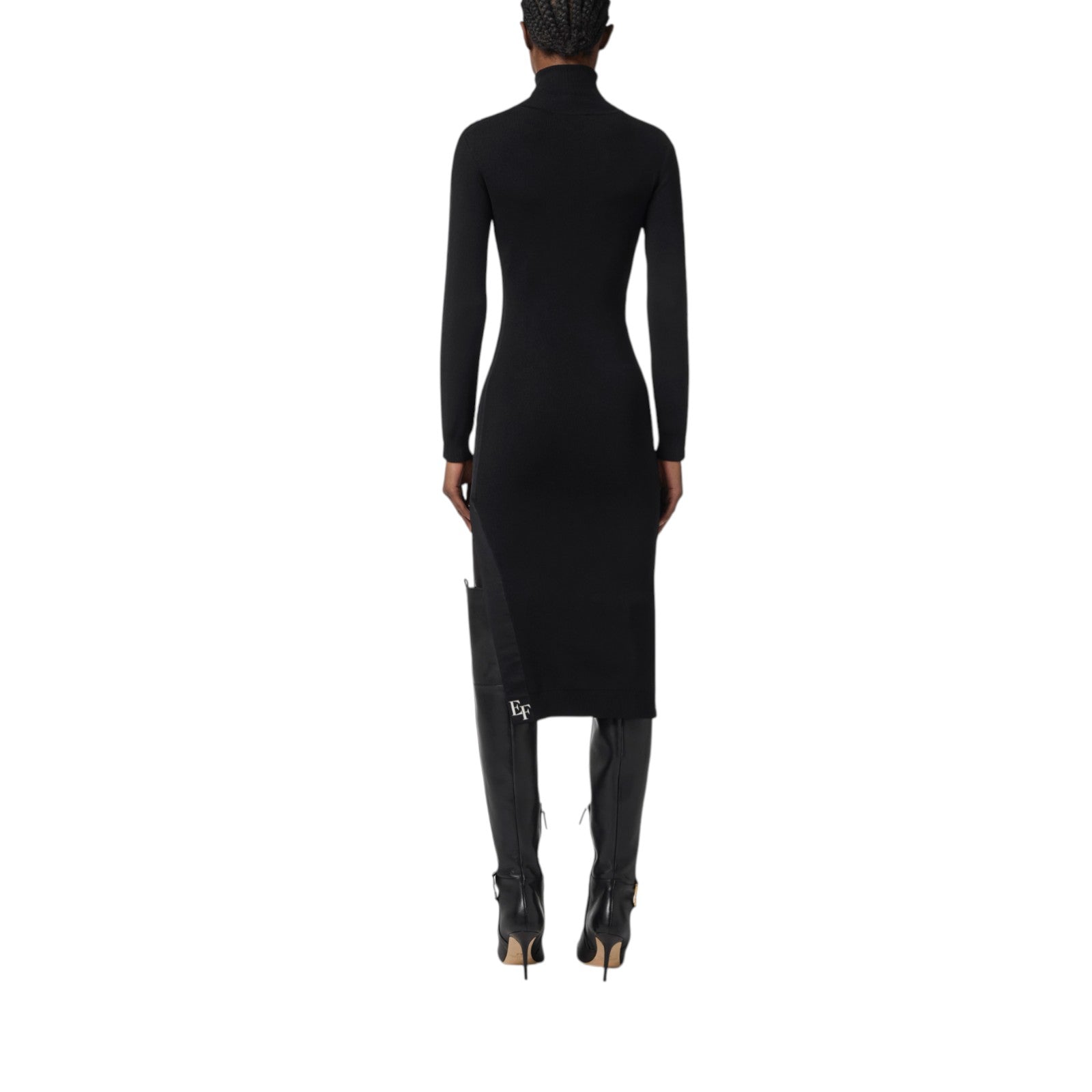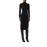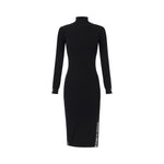 Abito a tubino in maglia dalla vestibilità aderente. Il vestito ha collo alto, maniche lunghe e si distingue per lo spacco laterale sormontato dalla banda in viscosa lucida. I dettagli logo resi da intarsi e colori a contrasto elevano il design essenziale del capo con una nota grafica.