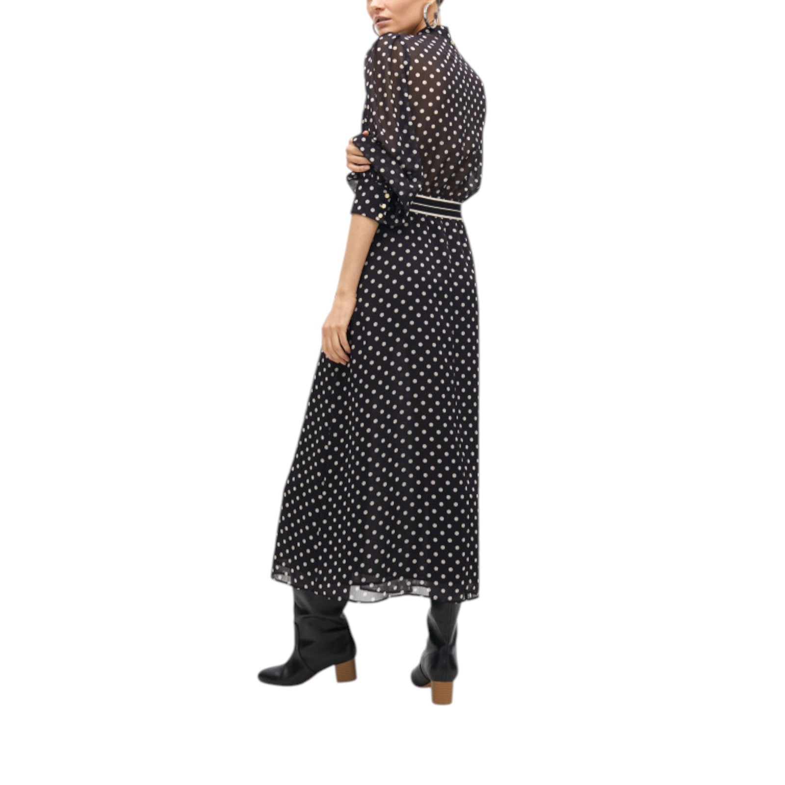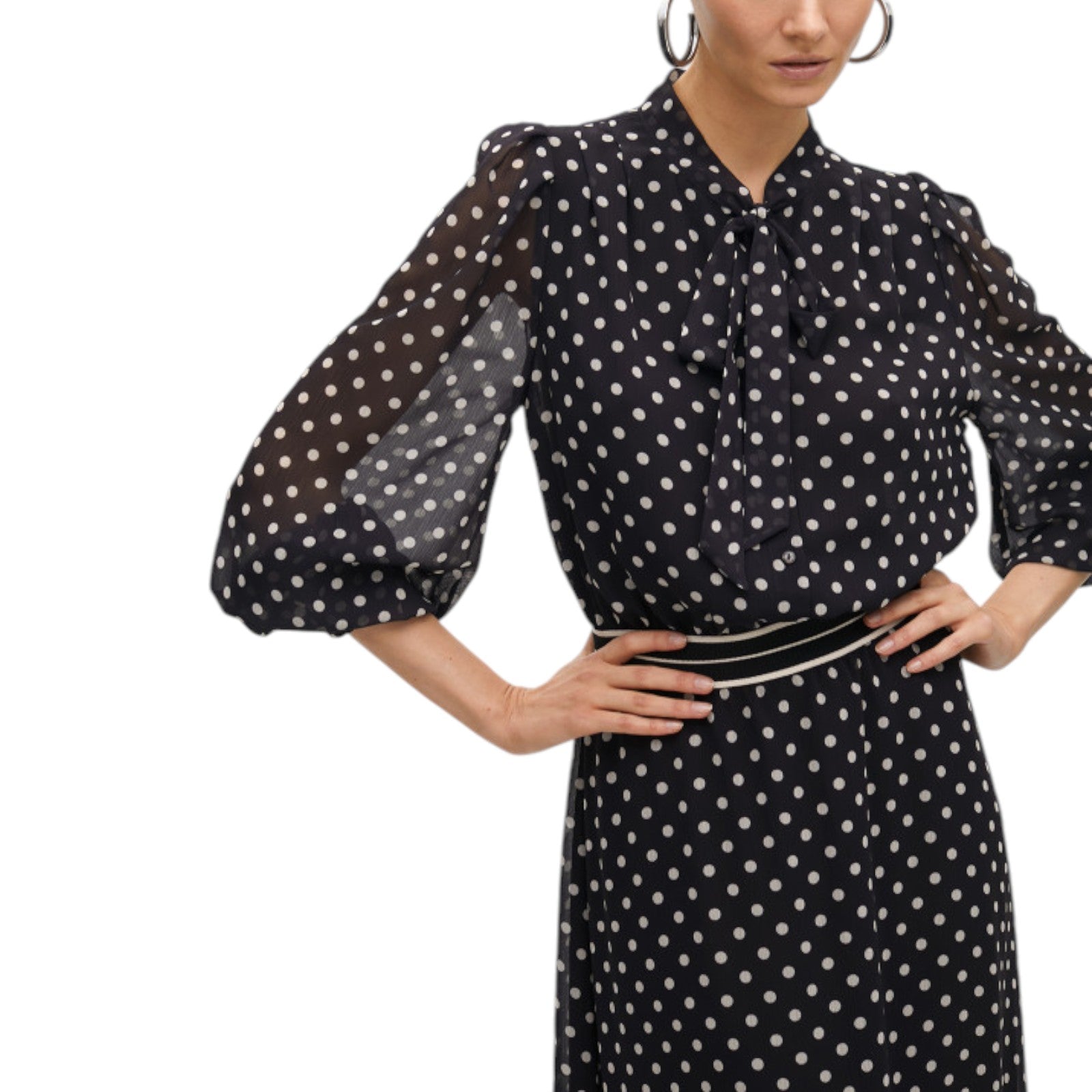 Elegante abito lungo con stampa a pois. Realizzato in tessuto leggero, si distingue per la caduta fluida e il fiocco al collo. Maniche a sbuffo con polsini elastici e vita aderente con dettaglio di nastro.