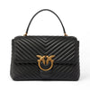 Elegante borsa grande a mano Big Lady Love Bag Puff, in nappa matelassé con motivo chevron. La chiusura con patta e bottone automatico è completata dall'iconica fibbia in metallo Love Birds Diamond Cut. L'interno è foderato in microfibra scamosciata e comprende tramezza chiusa con zip e tasca a parete. La borsa è completa di manico superiore per la portata a mano, ma include anche tracolla rimovibile a catena metallica rotonda con spallaccio regolabile in nappa.