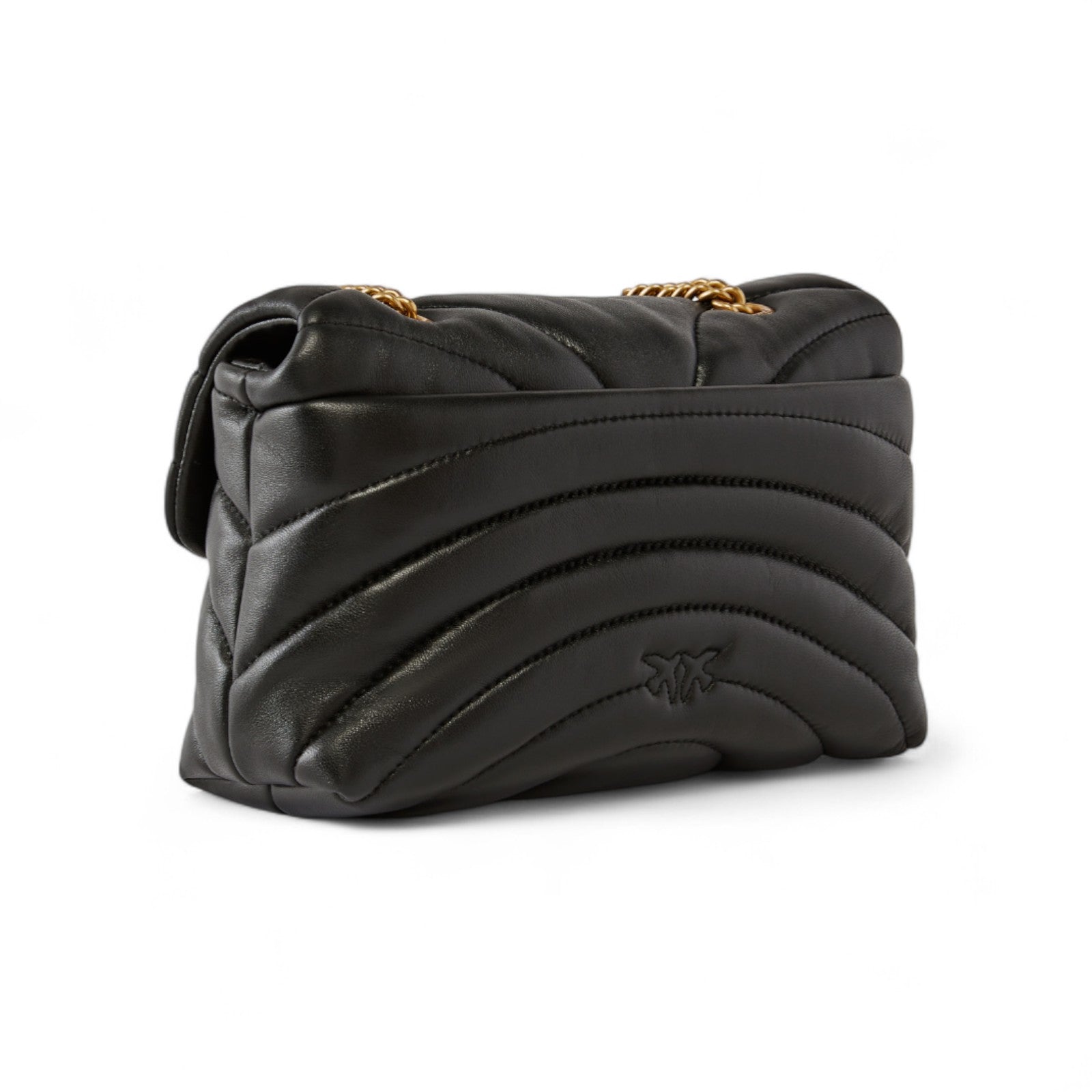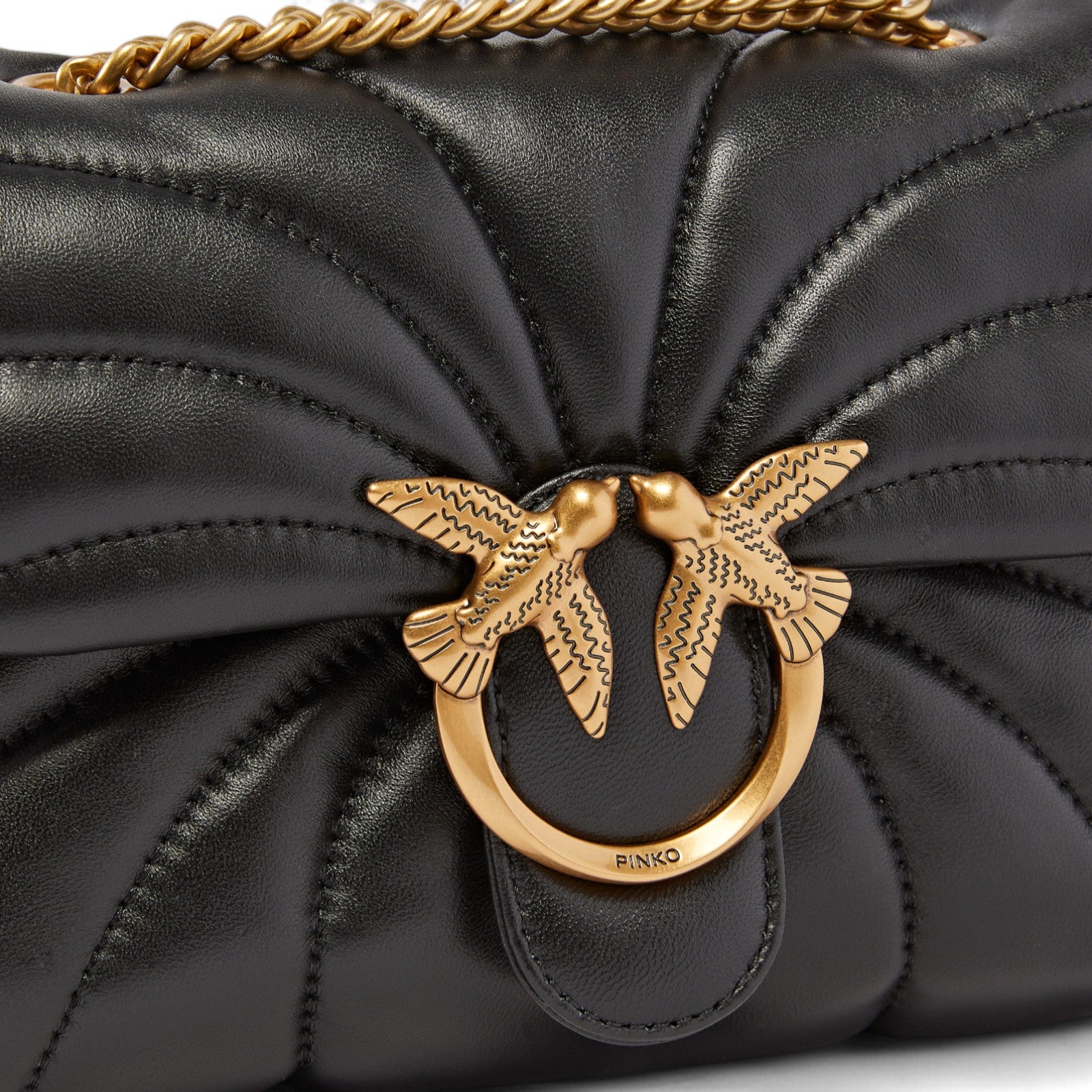 Borsa piccola morbida a tracolla Mini Love Bag Puff in nappa con trapuntatura Butterfly, che ricorda la caratteristica sagoma delle ali di farfalla. La tracolla a catena in metallo con spallaccio in nappa è scorrevole, e può essere doppiata per indossare la borsetta a spalla. La chiusura con patta è completata dall'iconica fibbia in metallo Love Birds Diamond Cut, galvanica antique gold. L'interno è foderato in microfibra scamosciata e comprende una pratica tramezza chiusa con zip e una tasca interna, per una migliore gestione dello spazio.