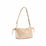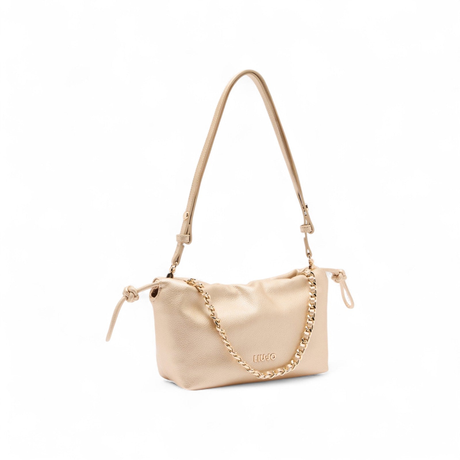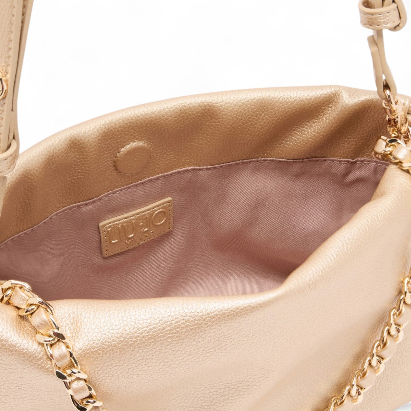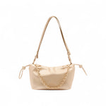Borsa a spalla effetto bottalato. Logo in metallo. Comodo manico con catena intrecciata. Tracolla rimovibile. Tasca interna. Etichetta interna logata. Chiusura con coulisse. Fodera interna. Misure: 23 x 10 x 15 cm.