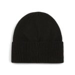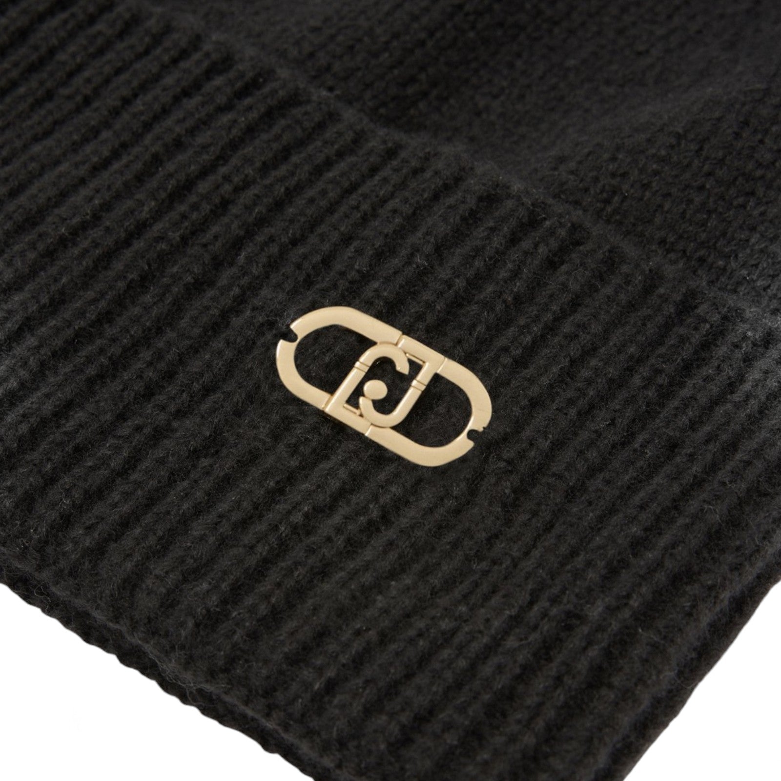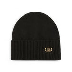 Set coordinato nero. Berretto beanie in maglia. Stola con motivo check. Logo in metallo.