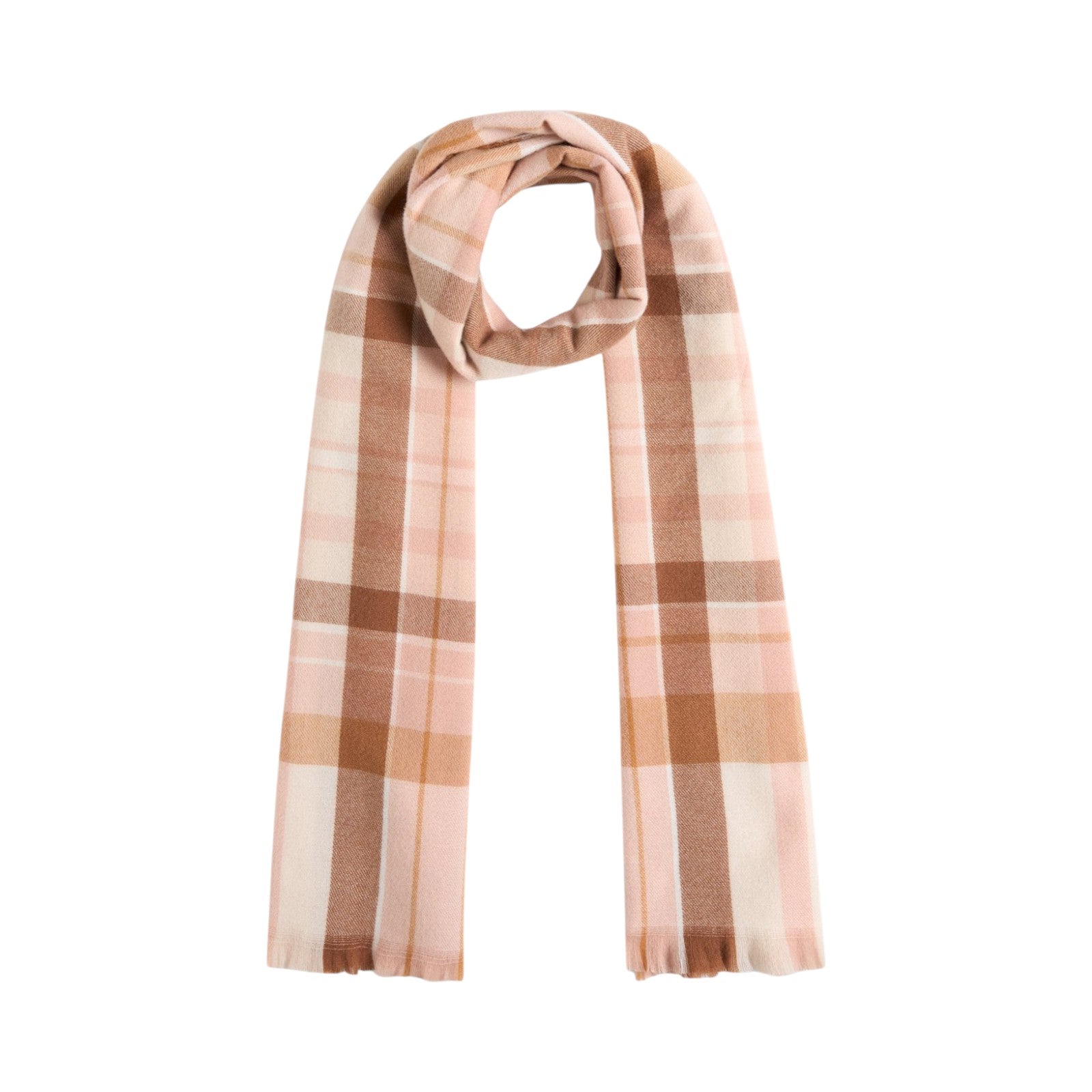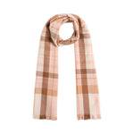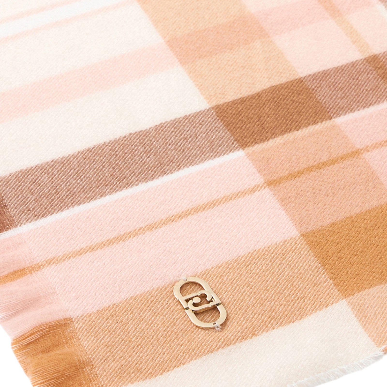 Set coordinato bianco. Berretto beanie in maglia. Stola con motivo check. Logo in metallo.