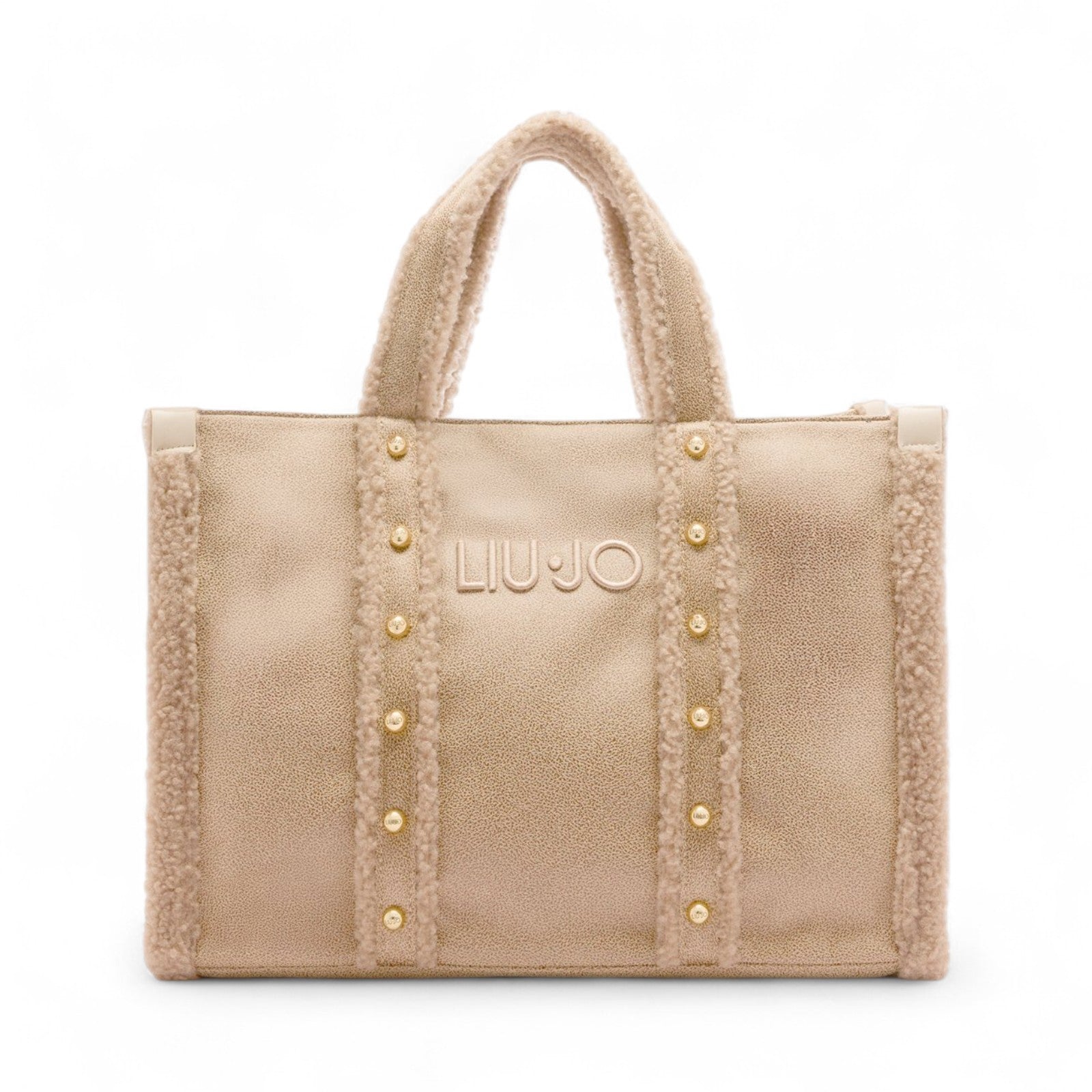 Shopping bag beige. Realizzata in tessuto spalmato effetto montone. Dettagli in teddy. Logo ricamato. Borchie applicate. Comodi manici. Tracolla logata regolabile e rimovibile in gros grain. Tasca interna con zip. Chiusura con zip. L'accessorio può essere indossato anche a tracolla e/o a spalla. Misure: 40 x 30 x 20 cm.