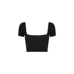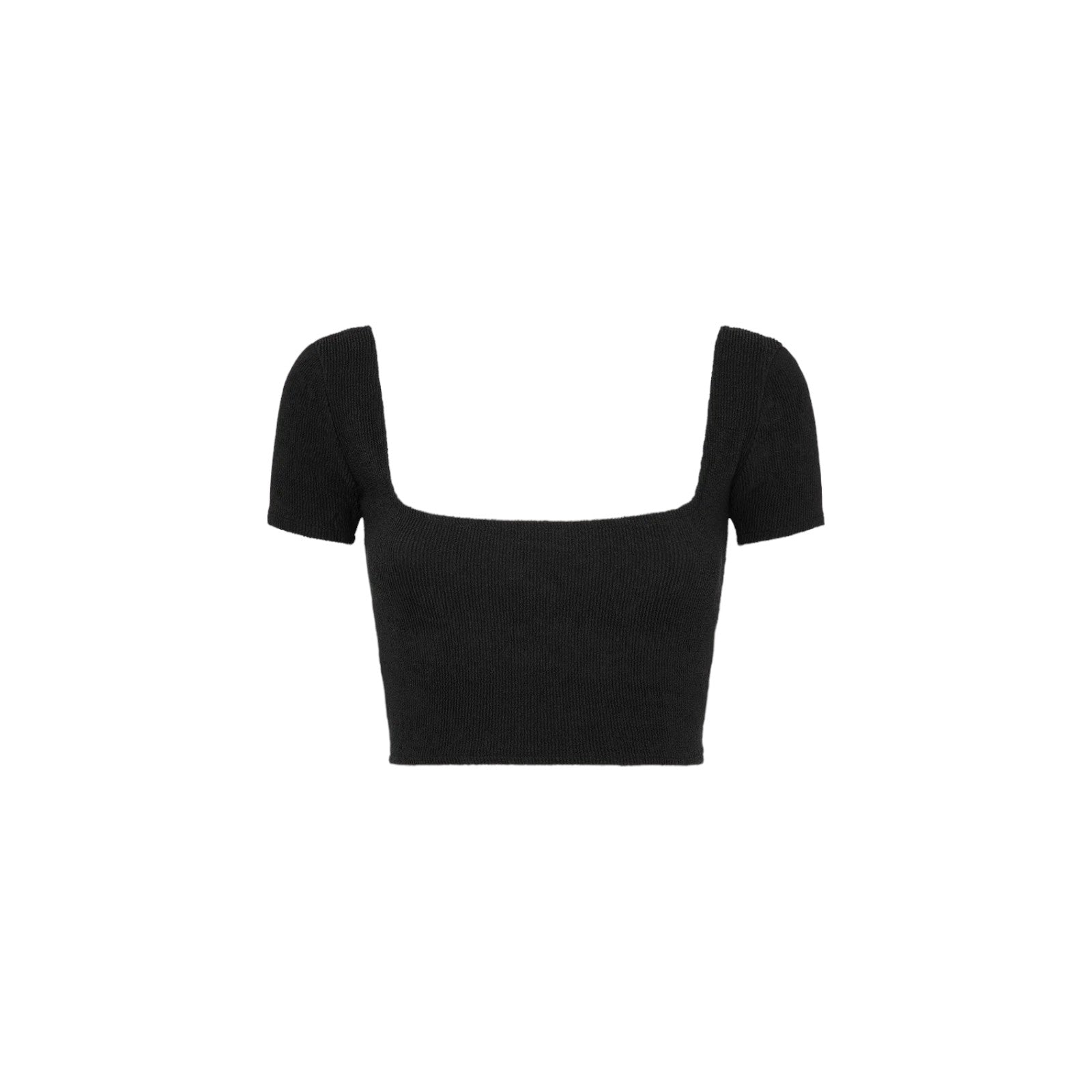 Crop Top in tessuto lycra goffrata nero, con schiena scoperta e accessorio anello sul retro.