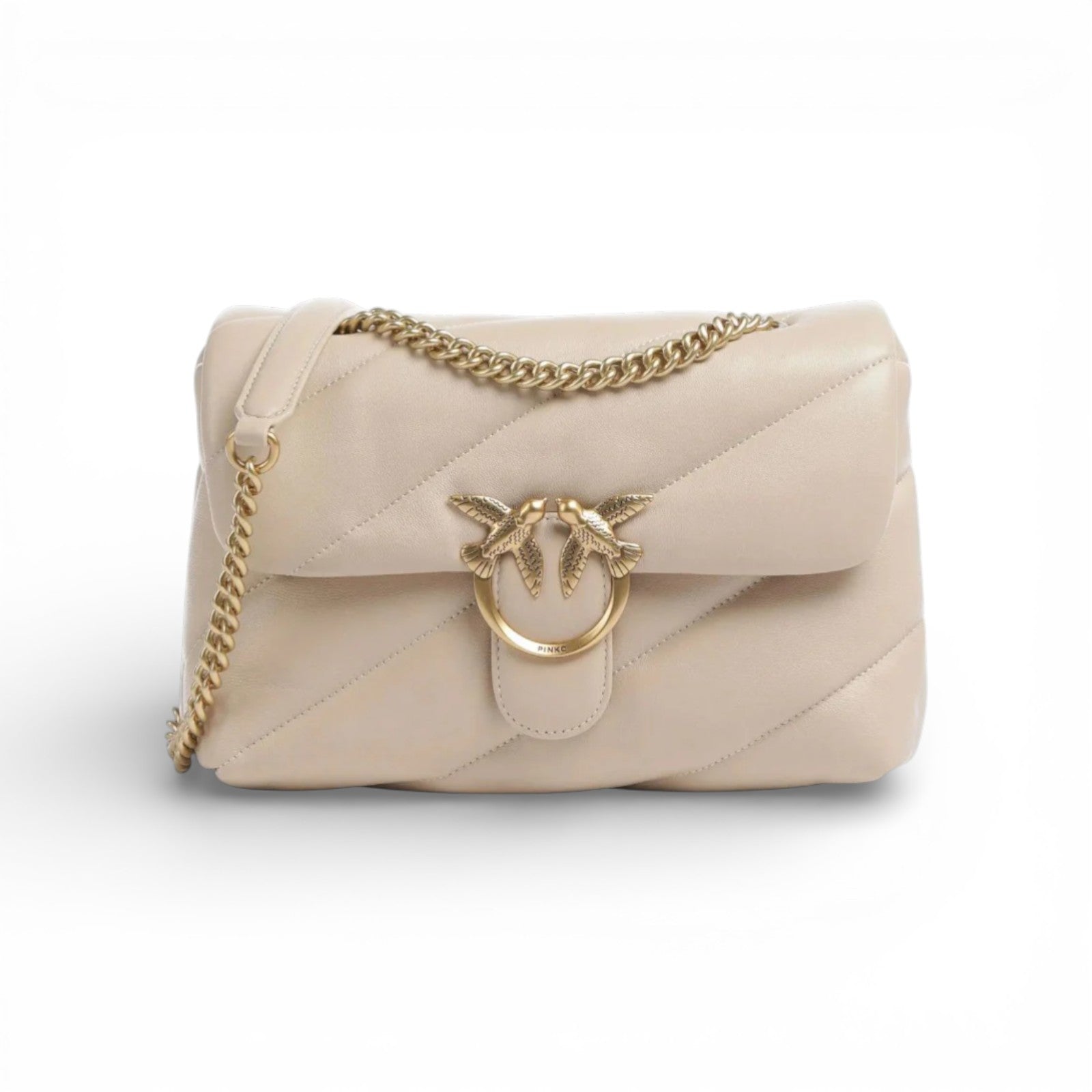 Baby Love Bag Puff in morbida nappa con maxi trapuntatura obliqua. La chiusura è completata dall'iconica fibbia in metallo Love Birds Diamond Cut. L'interno è foderato in microfibra scamosciata e comprende tasca a parete chiusa con zip. Completa di tracolla sottile a catena in metallo.
