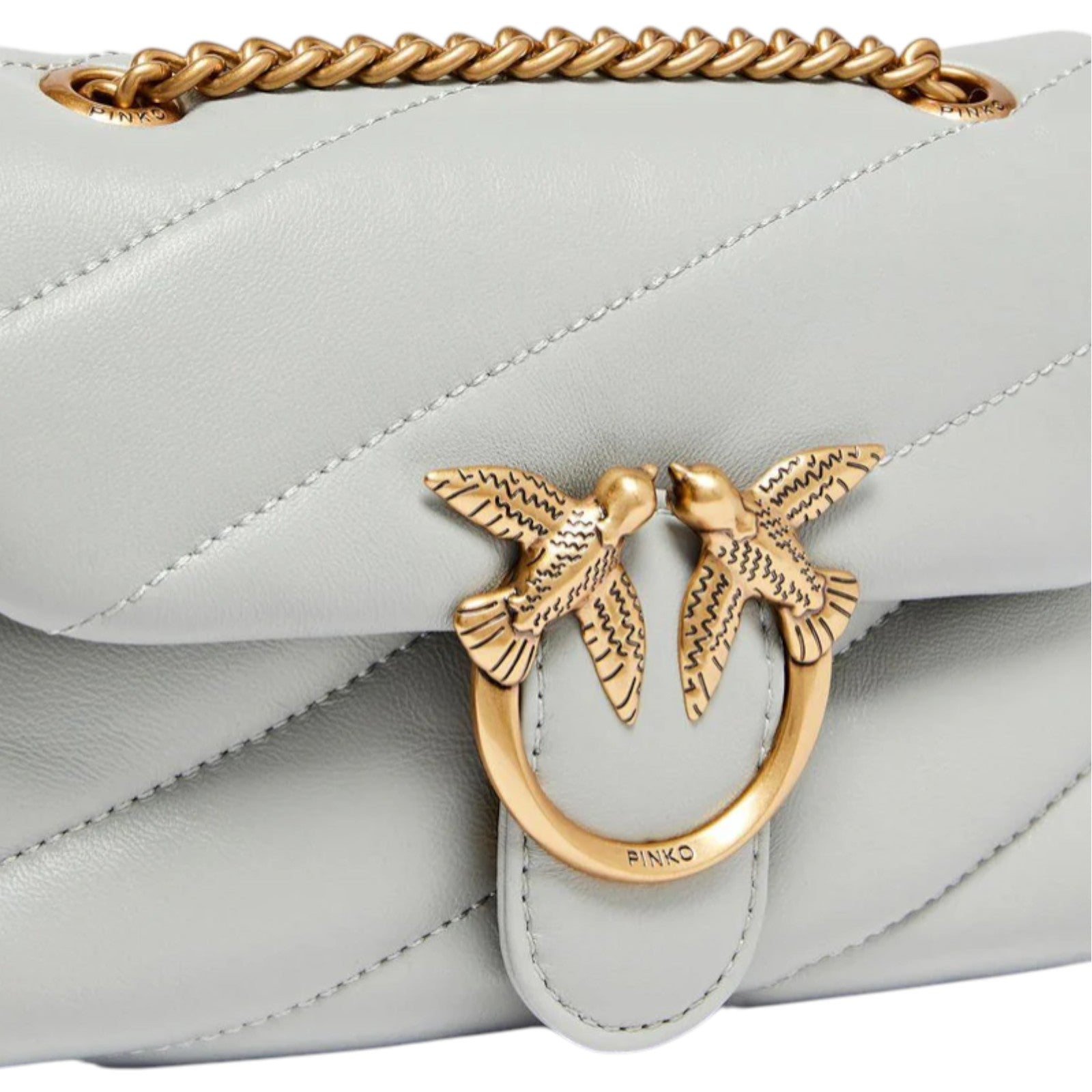 Baby Love Bag Puff in morbida nappa con maxi trapuntatura obliqua. La chiusura è completata dall'iconica fibbia in metallo Love Birds Diamond Cut. L'interno è foderato in microfibra scamosciata e comprende tasca a parete chiusa con zip. Completa di tracolla sottile a catena in metallo.