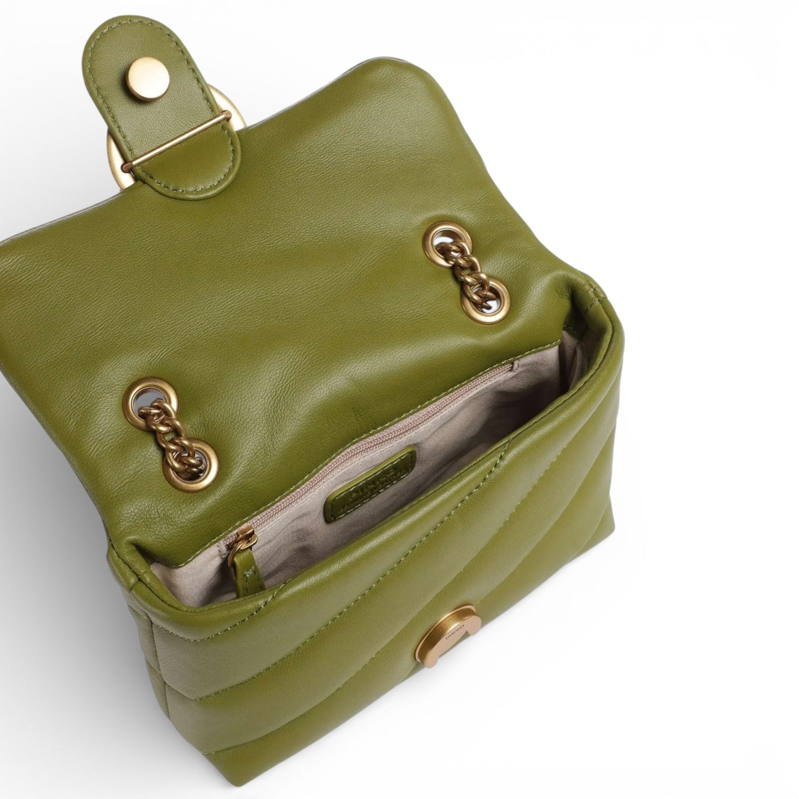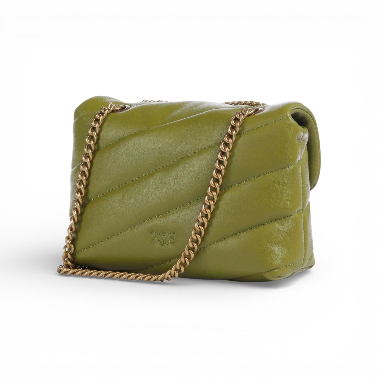 Baby Love Bag Puff in morbida nappa con maxi trapuntatura obliqua. La chiusura è completata dall'iconica fibbia in metallo Love Birds Diamond Cut. L'interno è foderato in microfibra scamosciata e comprende tasca a parete chiusa con zip. Completa di tracolla sottile a catena in metallo.