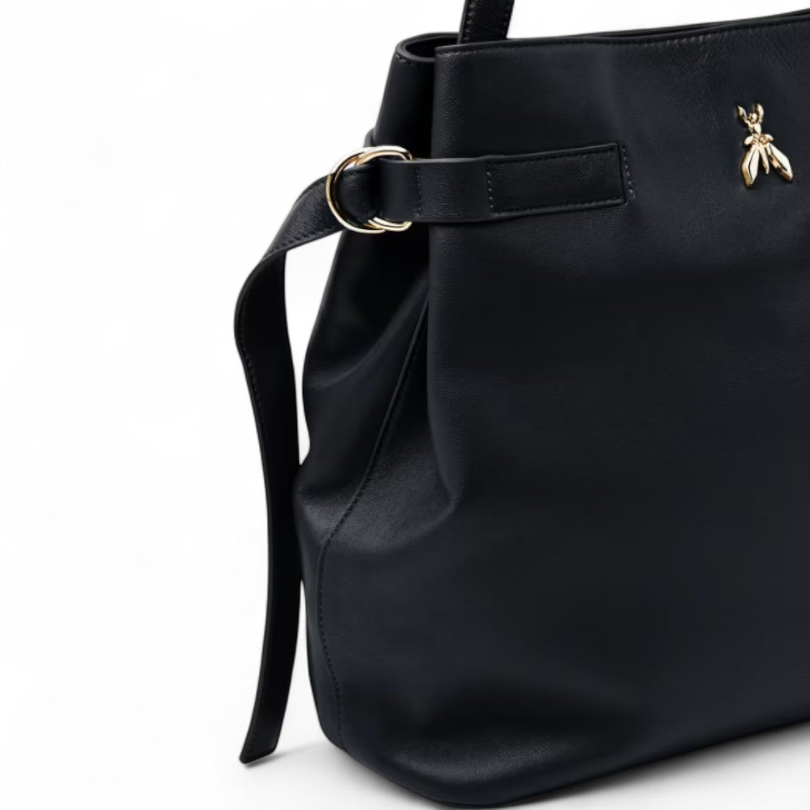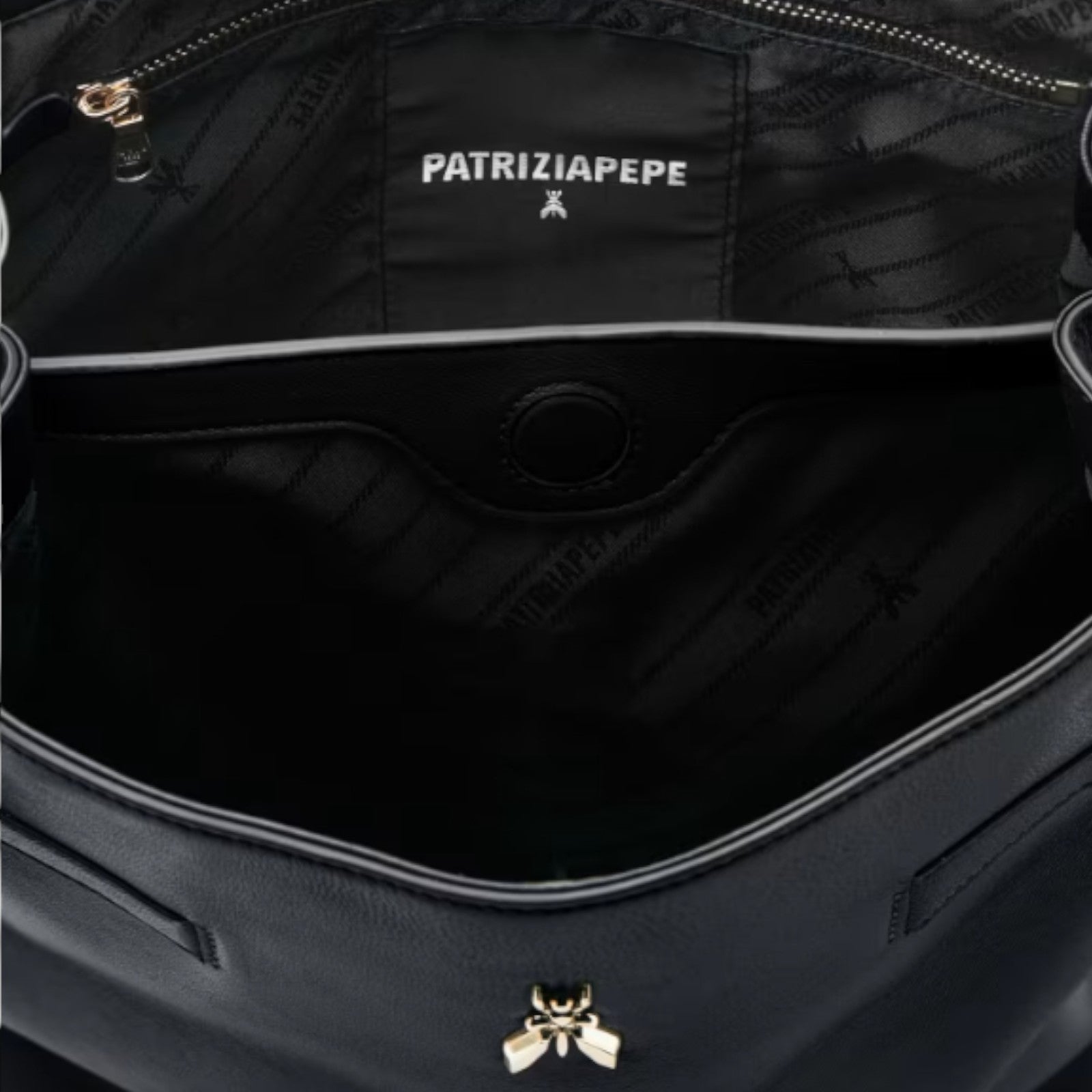 Borsa in pelle di vitello liscia. Logo Fly in metallo da 35 mm Manigliotto in pelle regolabile a due misure tramite gemelli; chiusura con calamita; lacci laterali per la regolazione dell'ampiezza. Interno con tramezza centrale, tasca con zip e tasca aperta; label in tessuto "Patrizia Pepe Fly".