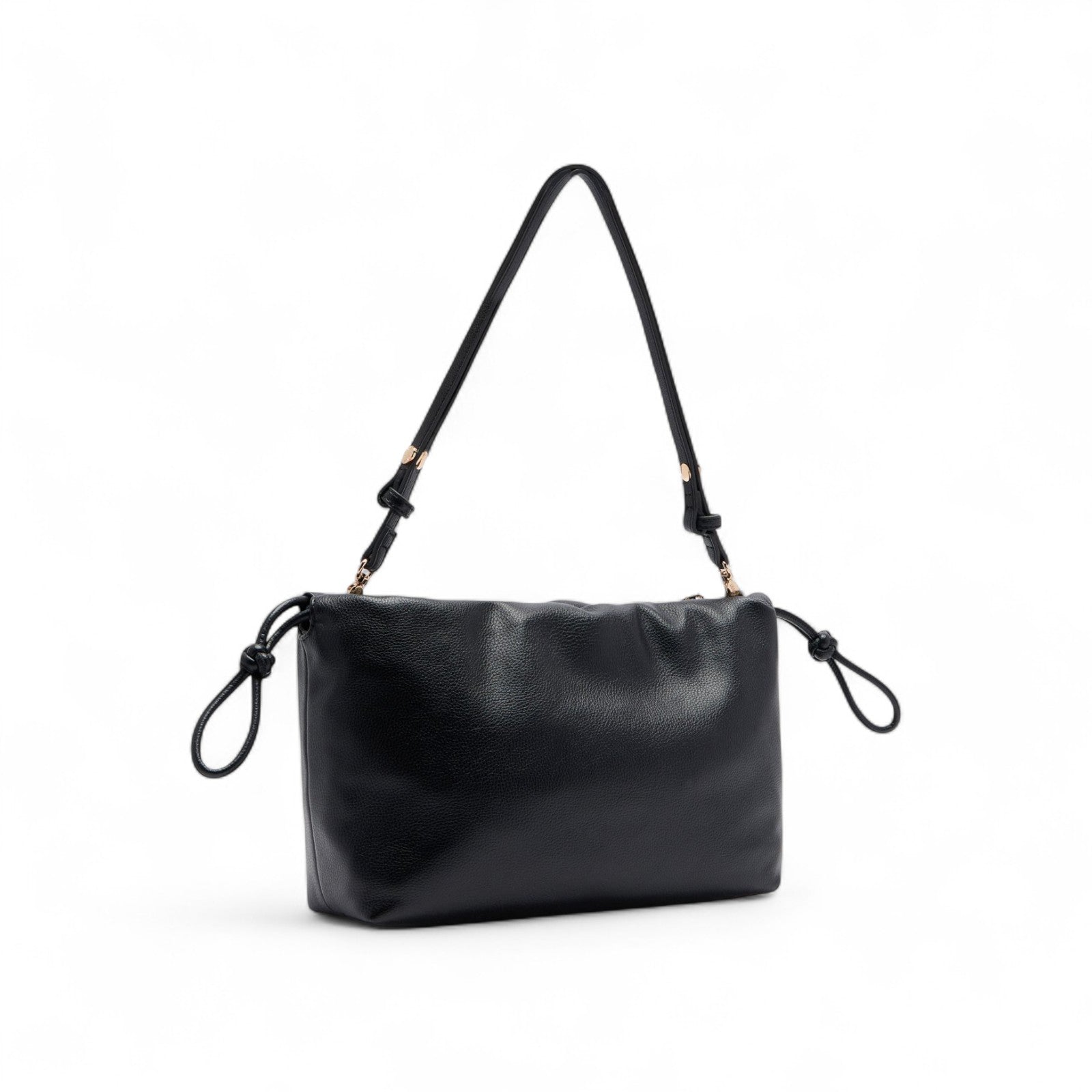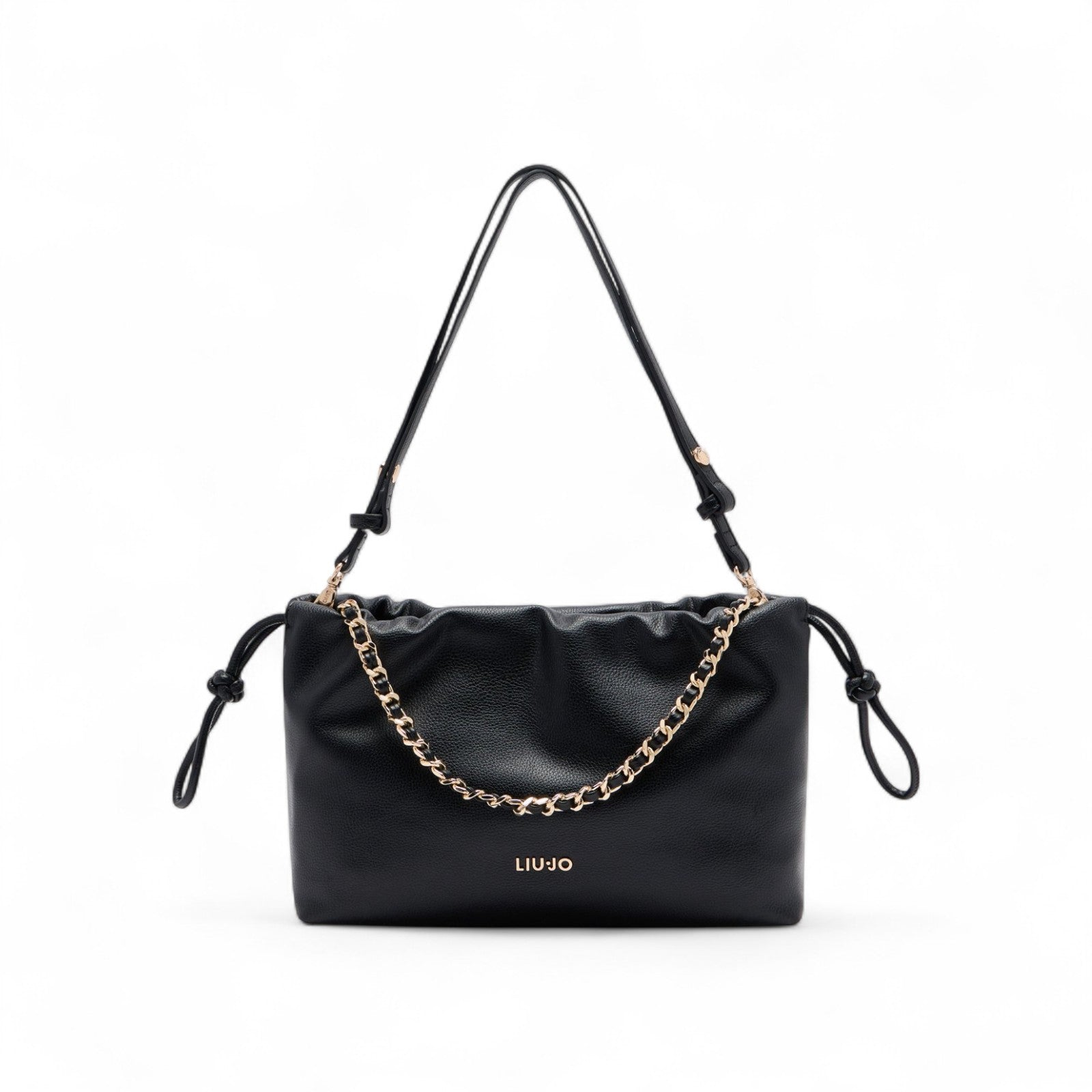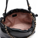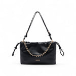 Borsa a spalla nera. Stampa effetto bottalato. Logo in metallo. Comodo manico con catena intrecciata. Tracolla rimovibile. Tasca interna. Etichetta interna logata. Chiusura con coulisse. Fodera interna. Misure: 30 x 11 x 20 cm.