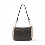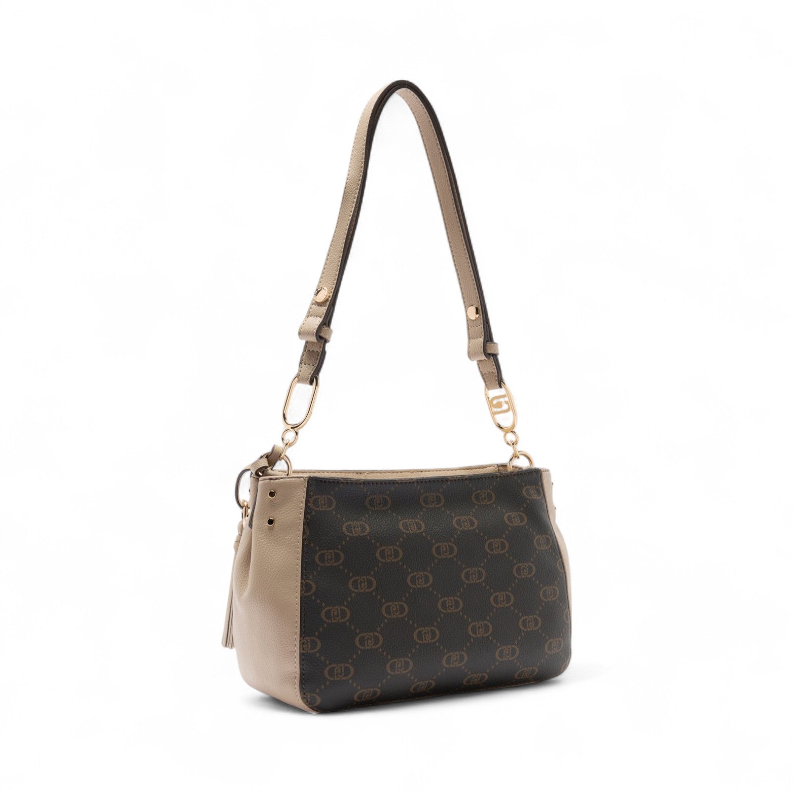 Misure: 27 x 10 x 19 cm. Borsa a spalla effetto bottalato. Stampa logo. Logo in metallo. Comodo manico. Charm nappina. Chiusura con zip. Fodera interna.