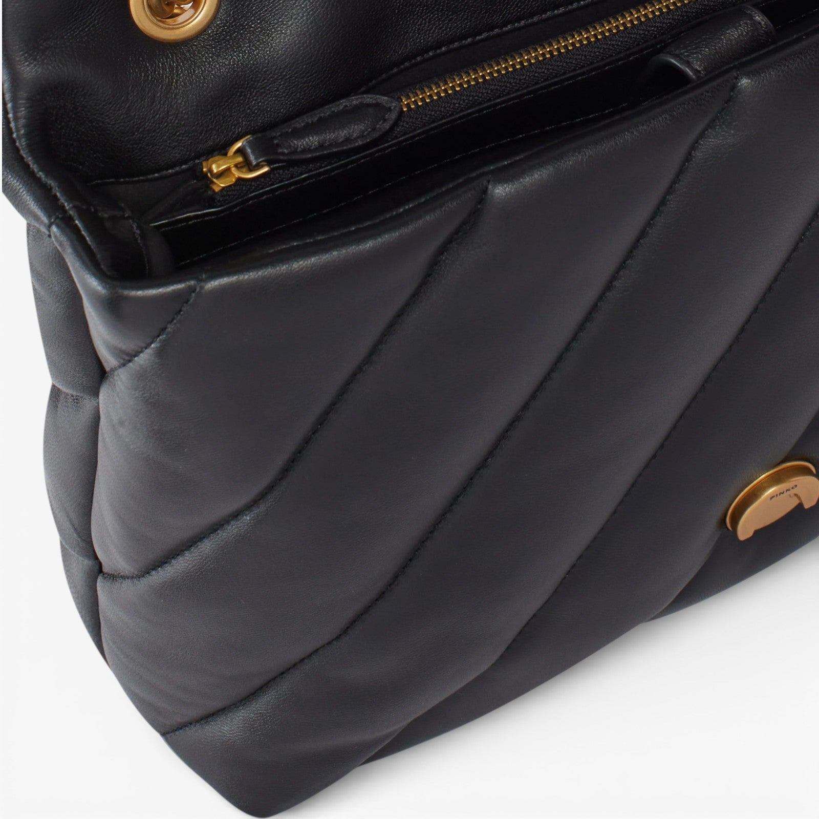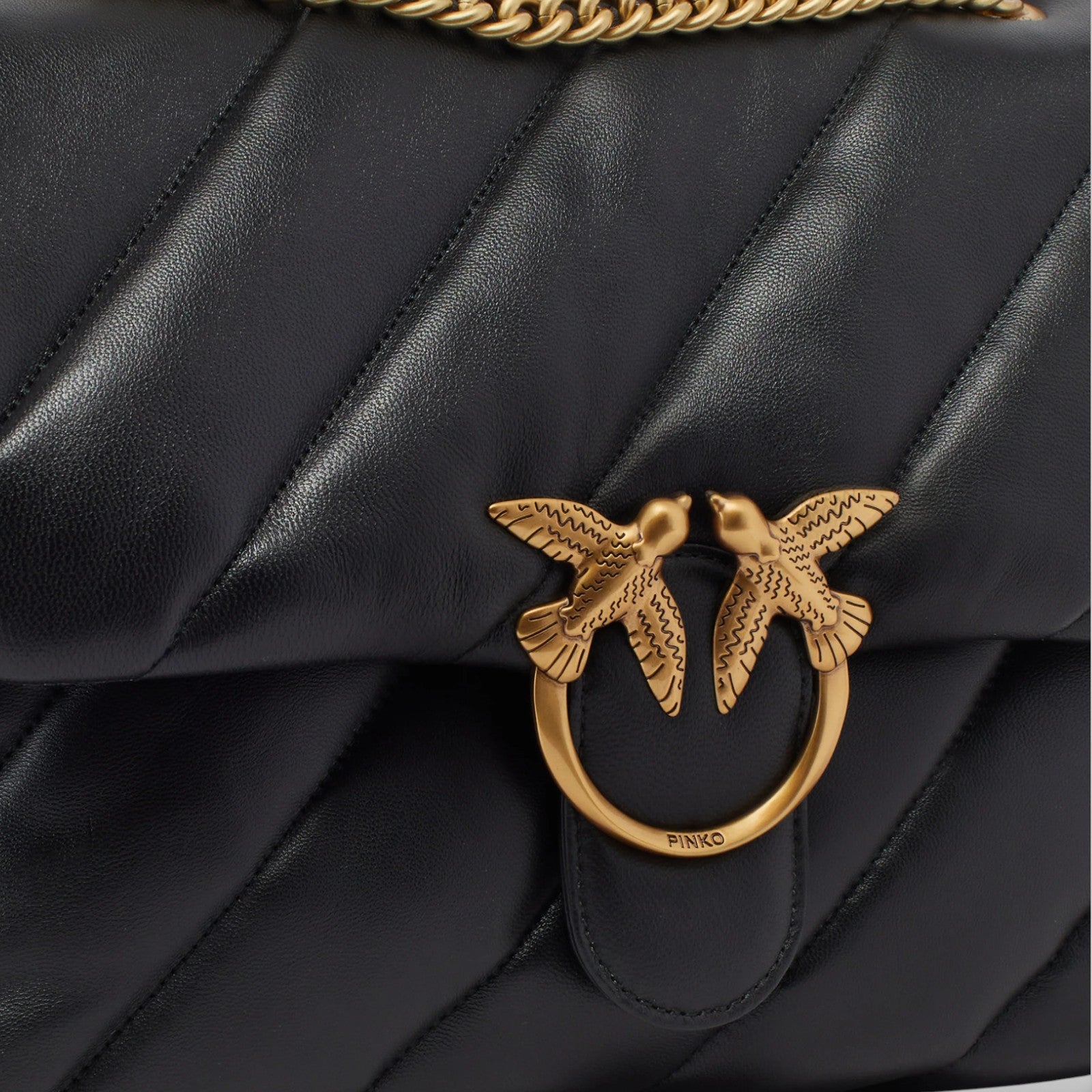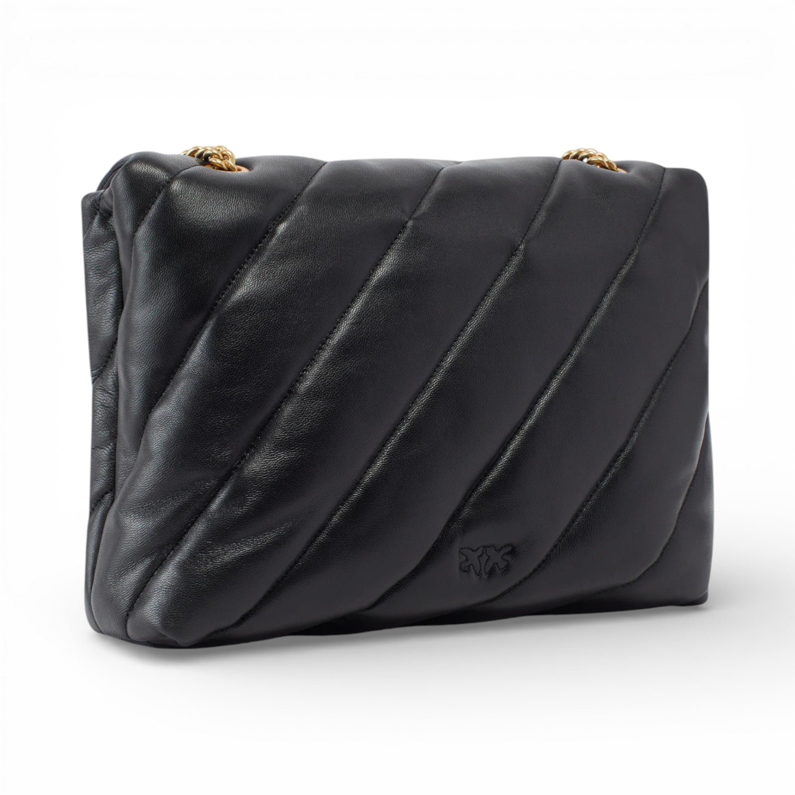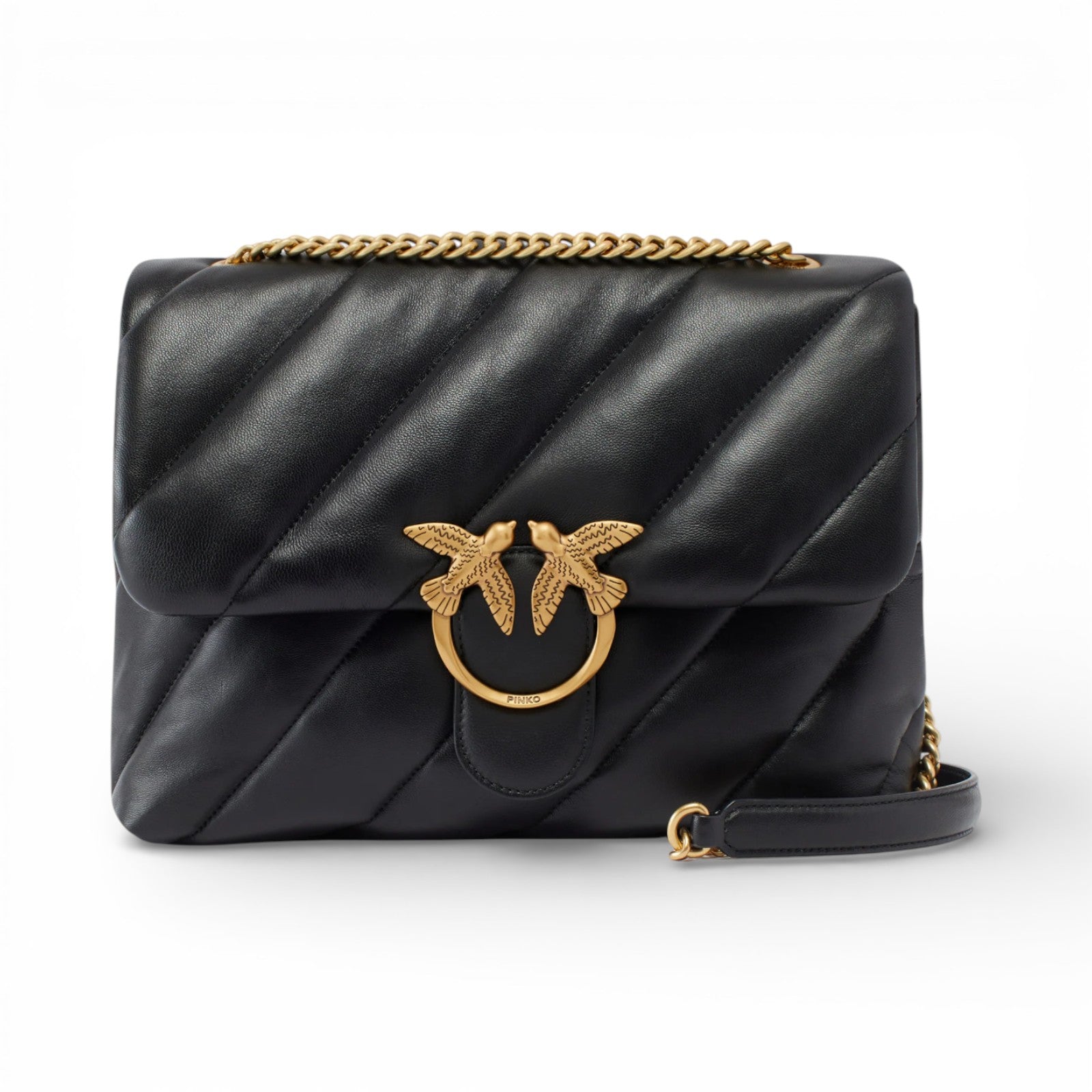 Big Love Bag Puff in morbida nappa con maxi trapuntatura obliqua. La chiusura è completata dall'iconica fibbia in metallo Love Birds Diamond Cut. L'interno è foderato in microfibra scamosciata e comprende tramezza chiusa con zip e tasca a parete. La tracolla combina la classica catena metallica rotonda al pratico spallaccio in nappa.