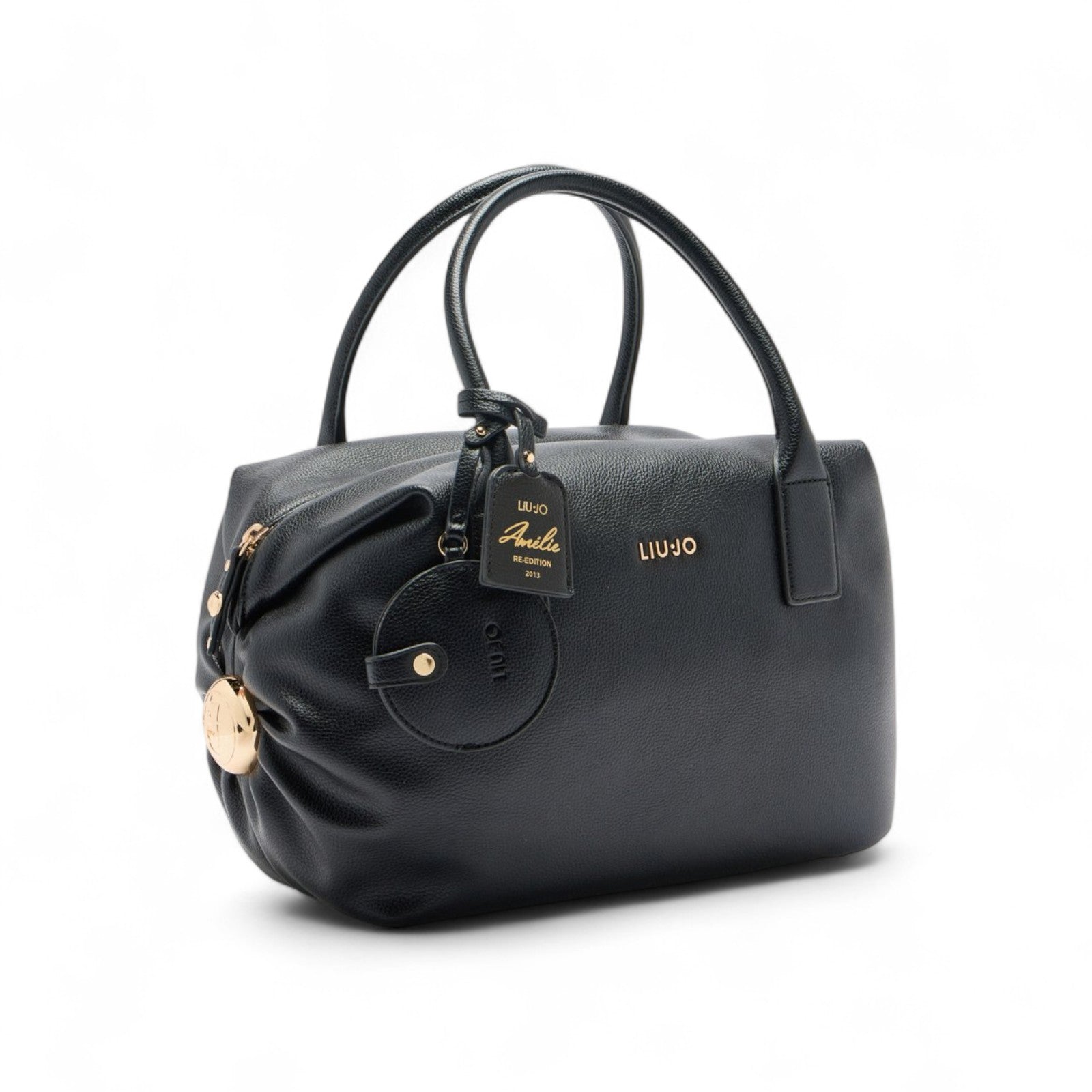 Borsa a mano nera. Stampa effetto bottalato. Logo in metallo. Comodi manici. Tracolla regolabile e rimovibile. Piedini metallici al fondo. Charms logati. Tasca interna con zip. Etichetta interna logata. Chiusura con zip. Fodera interna logata. Misure: 38 x 15 x 22 cm.