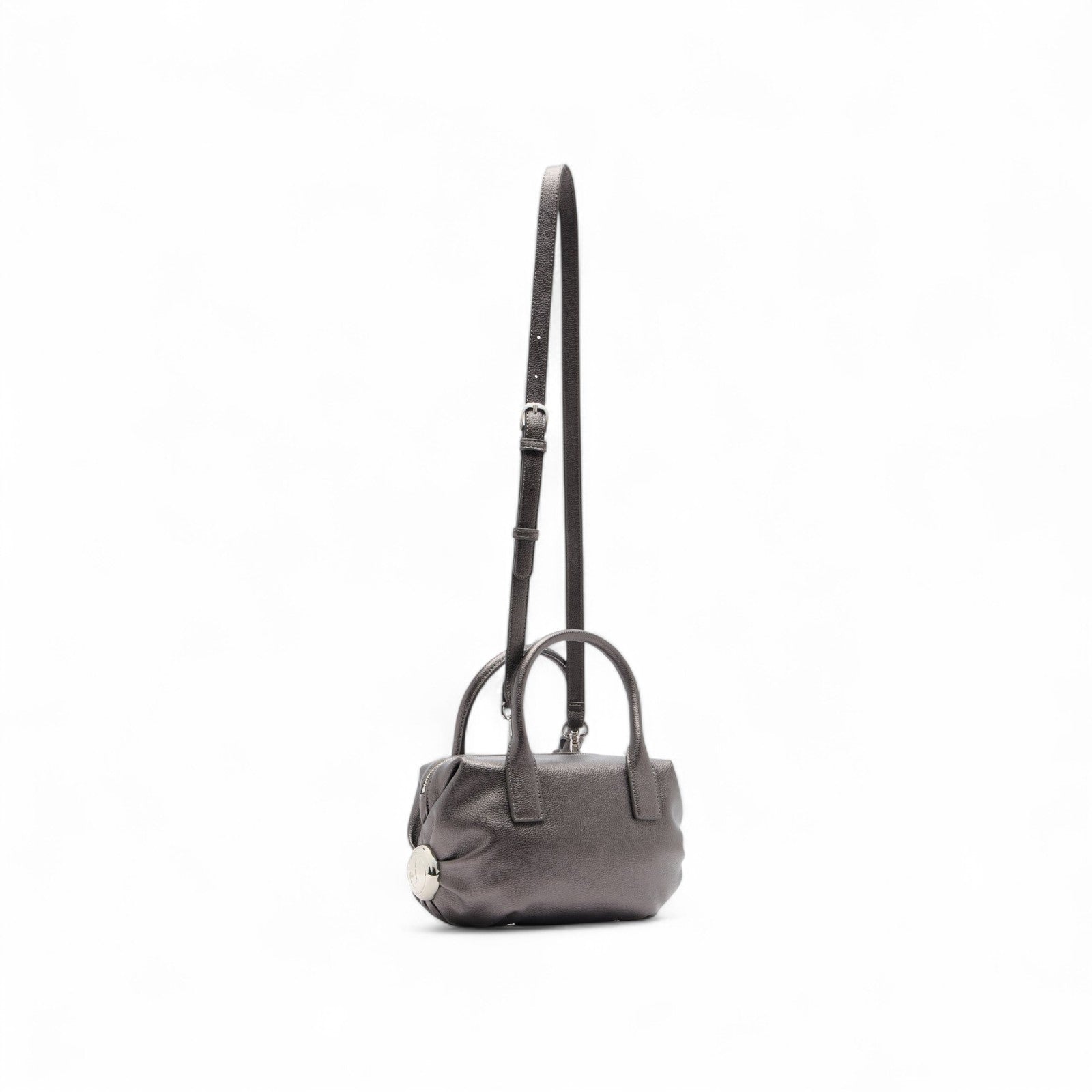 Mini borsa a mano grigia. Stampa effetto bottalato. Logo in metallo. Comodi manici. Tracolla regolabile e rimovibile. Piedini metallici al fondo. Charm in metallo dorato. Chiusura con zip. Fodera interna logata.