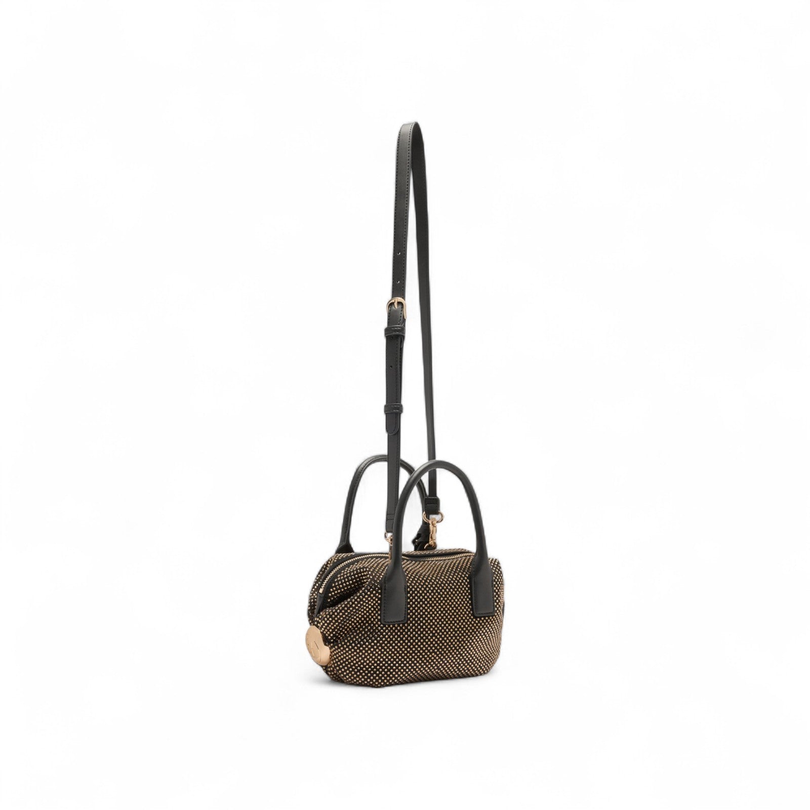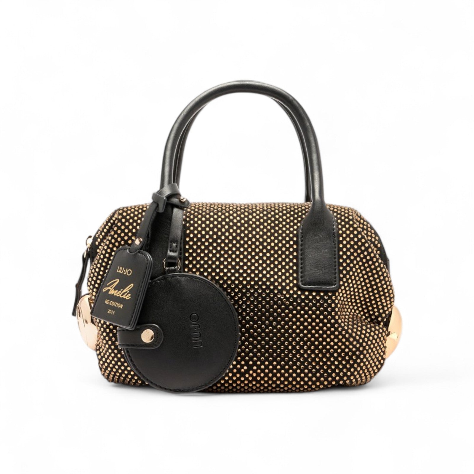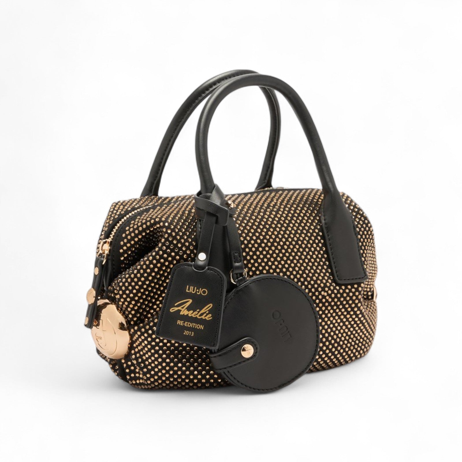 Mini borsa a mano in microfibra con strass. Logo in metallo. Comodi manici. Tracolla regolabile e rimovibile. Charms logati. Maxi borchie logate in metallo. Piedini metallici al fondo. Chiusura con zip. Fodera interna logata. L'accessorio può essere indossat. Misure: 27 x 12 x 16 cm.