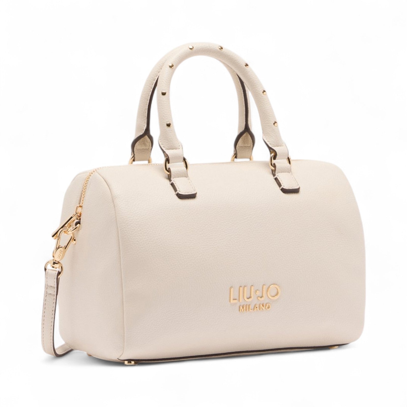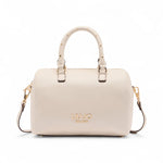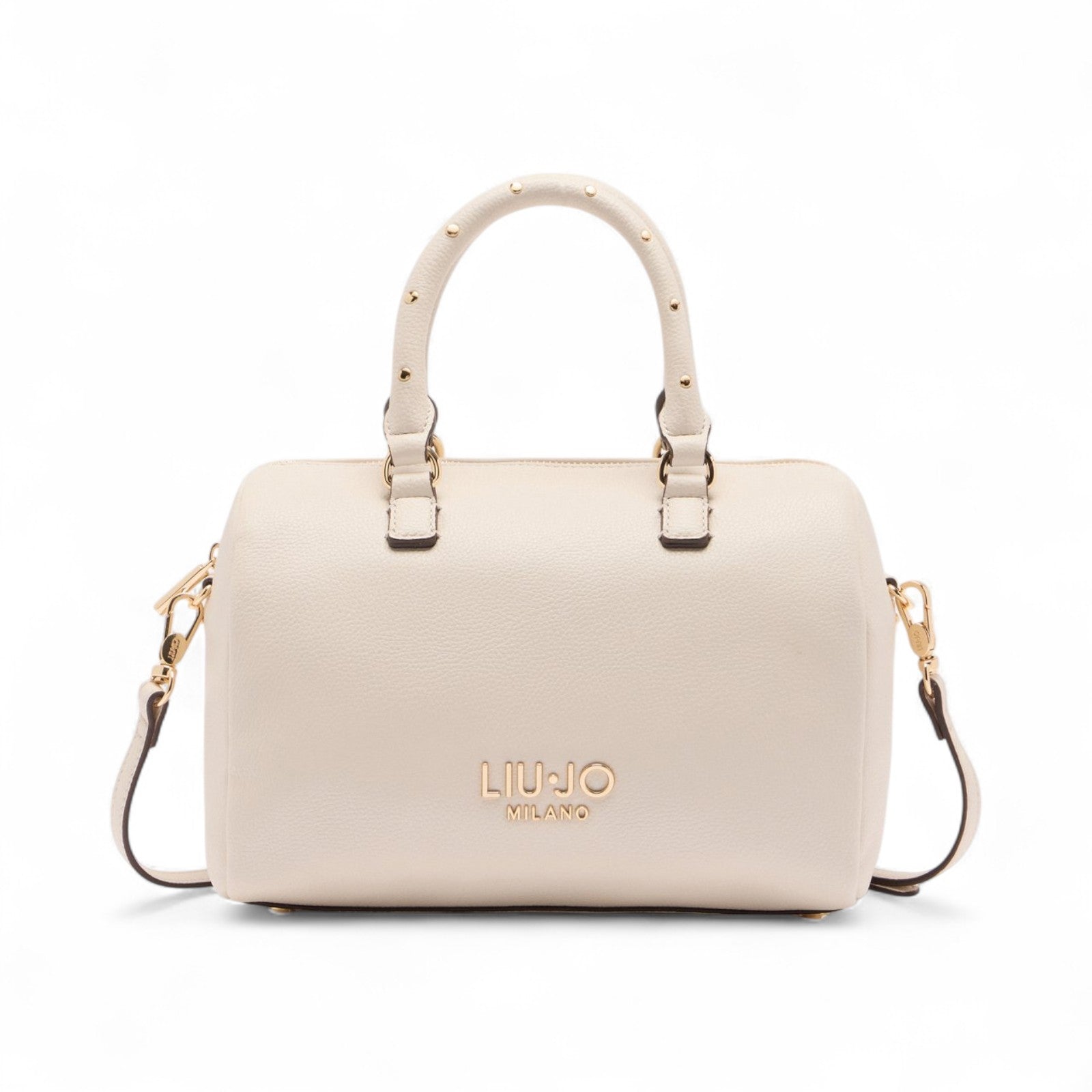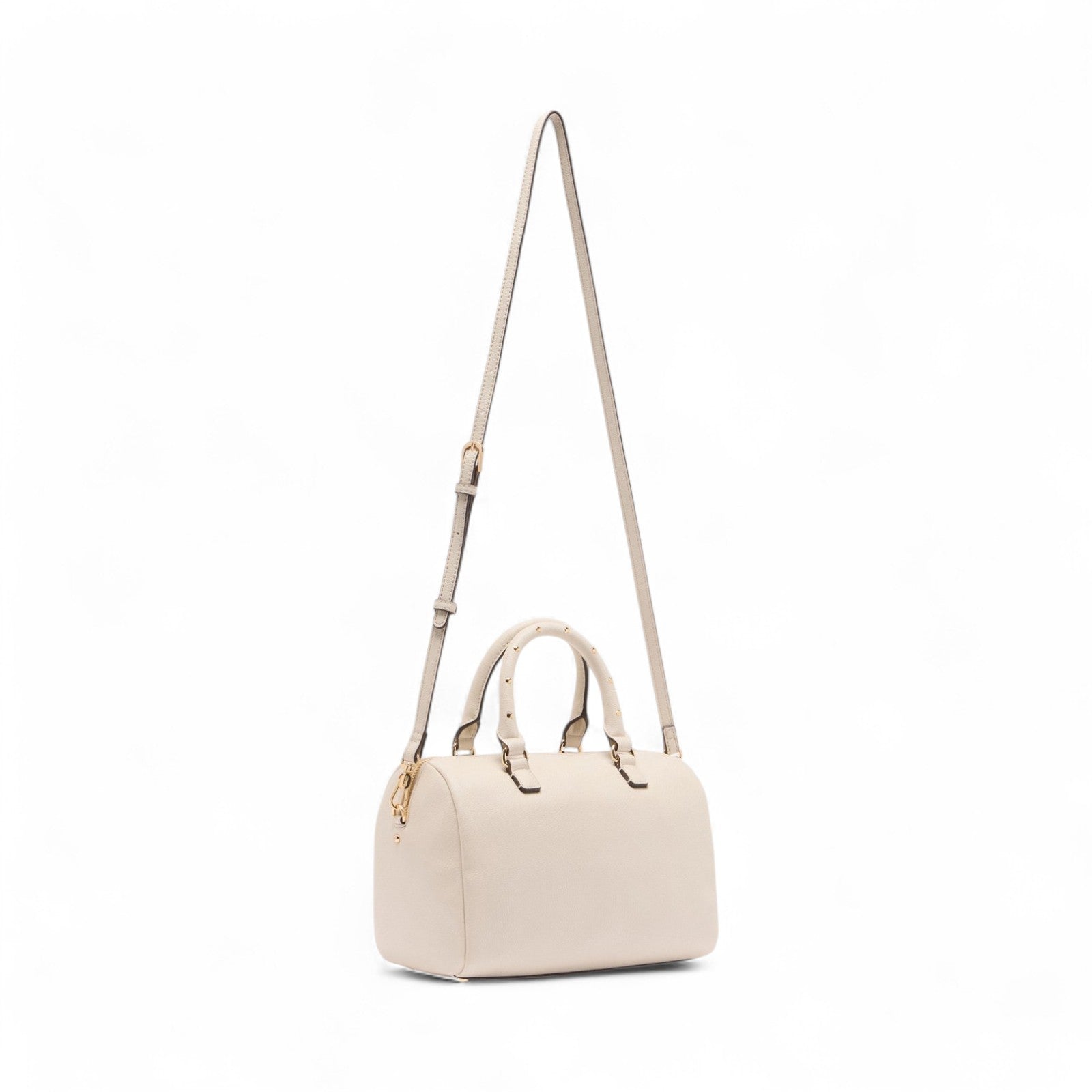 Borsa a mano bianca. Stampa effetto bottalato. Logo in metallo sul davanti. Comodi manici con borchie. Tracolla regolabile e rimovibile. Fodera interna logata. Chiusura con zip. Misure: 25 x 15 x 17 cm.