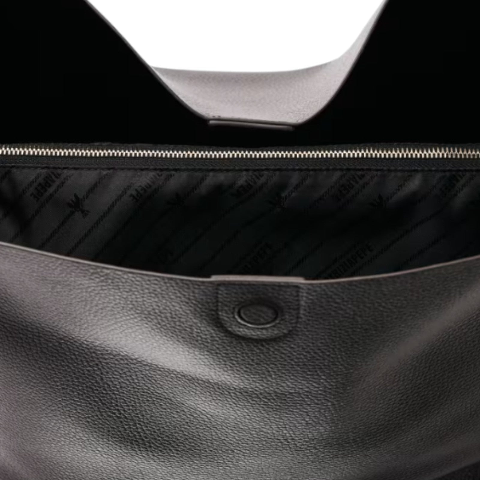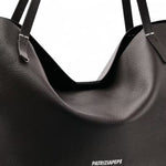 Borsa in pelle di vitello martellata resinata. Logo "PATRIZIAPEPE Fly" in rilievo. Punti a mano a contrasto colore su attacchi manici, chiusura con calamita. Pochette interna chiusa con zip, removibile con moschettoni.