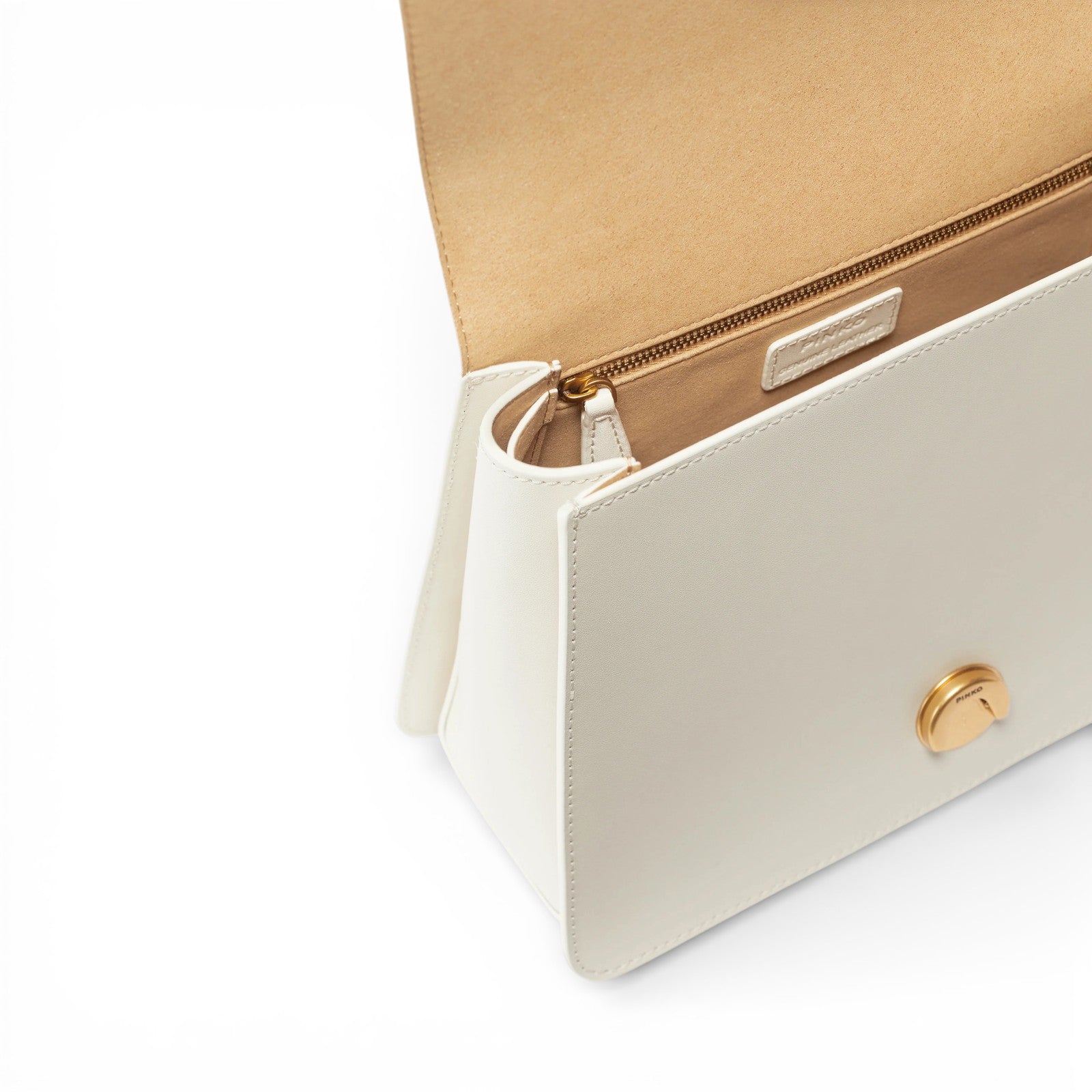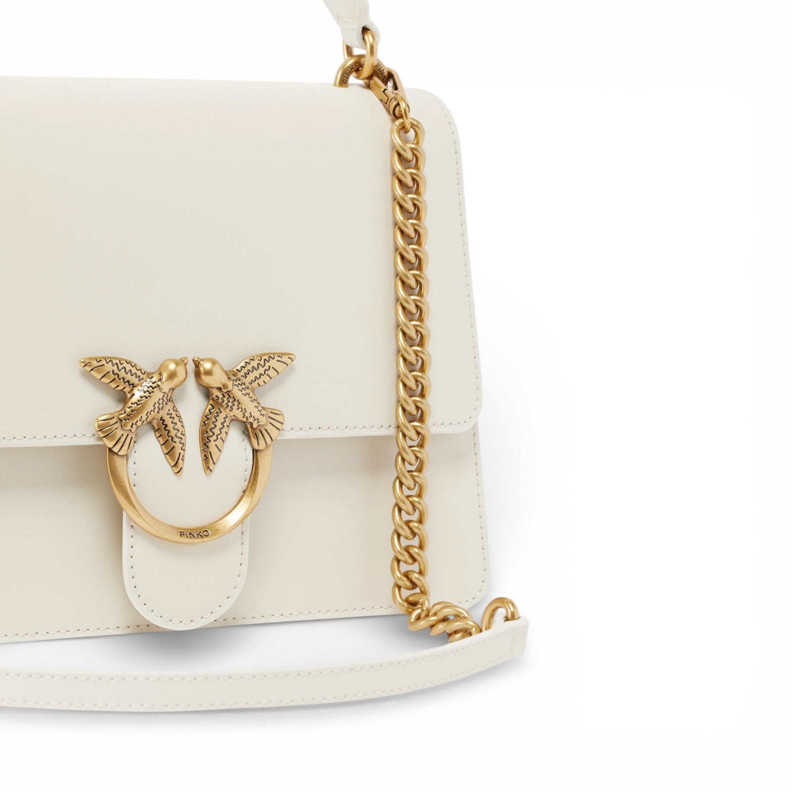 Mini Love Bag One Top Handle Light in morbida pelle mano seta, dal design decostruito e leggero. La chiusura è completata dall'iconica fibbia in metallo Love Birds Diamond Cut. L'interno è foderato in microfibra scamosciata e comprende tasca a parete con zip. Manico singolo top handle e tracolla regolabile e rimovibile in pelle.