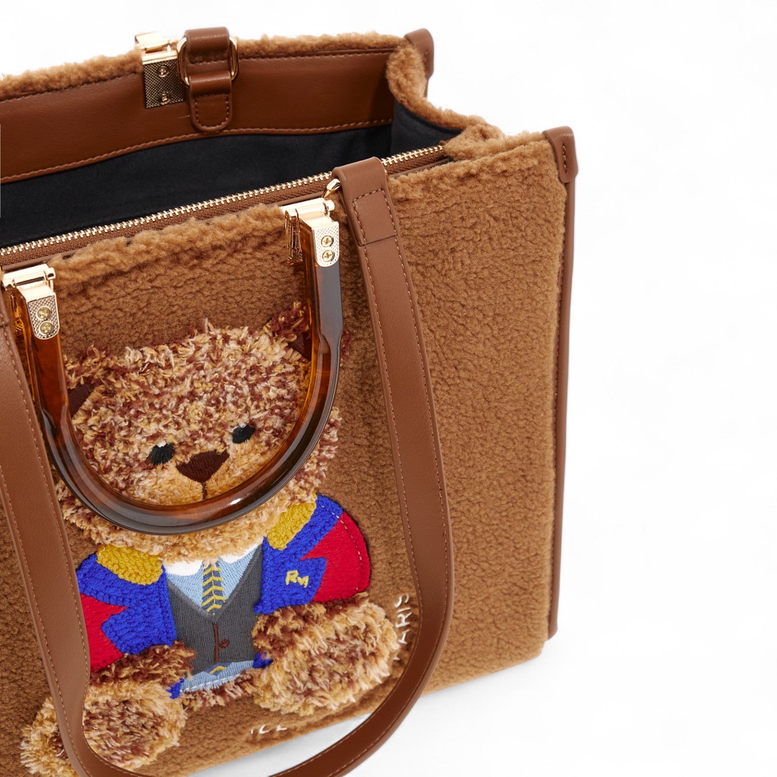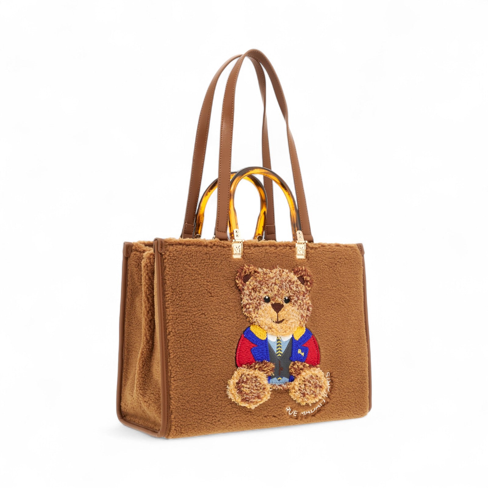 Tote bag in eco-montone con Iconico orsetto Marvin, logo ricamato e profili in ecopelle. Manici in resina con dettagli metallici logati e doppia tracolla. Tasca centrale in ecopelle con zip e fodera interna in cotone con tasca.