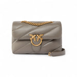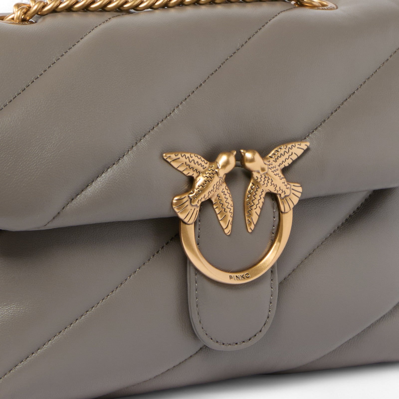Classic Love Bag Puff in morbida nappa con maxi trapuntatura obliqua. La chiusura è completata dall'iconica fibbia in metallo Love Birds Diamond Cut. L'interno è foderato in microfibra scamosciata e comprende tramezza chiusa con zip e tasca a parete. La tracolla combina la classica catena metallica rotonda al pratico spallaccio in nappa.