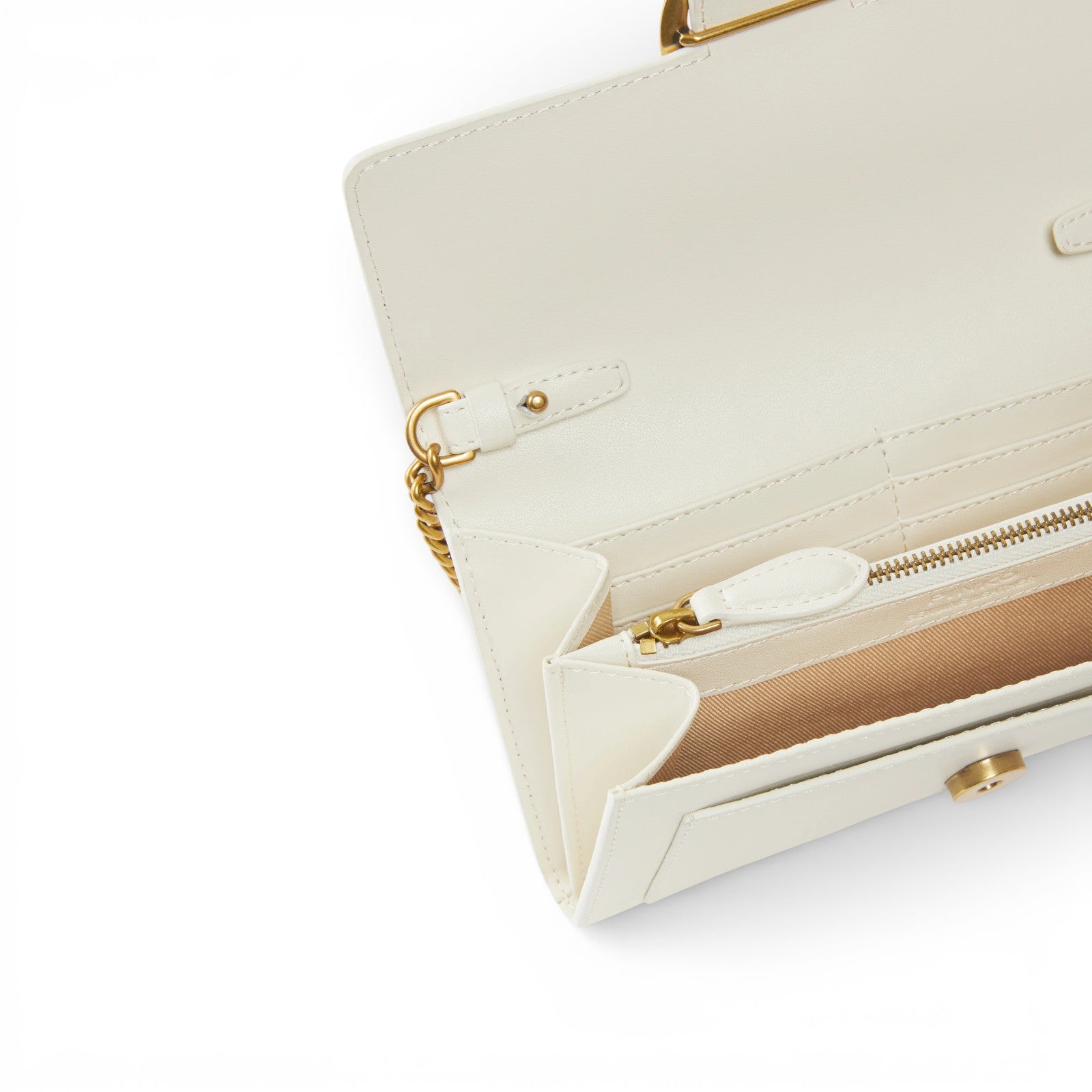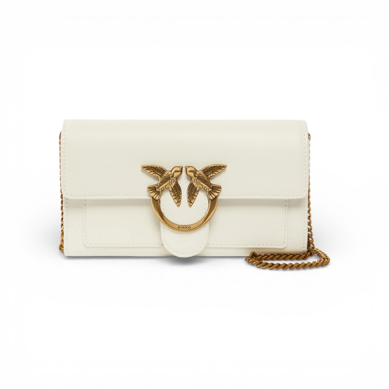 Portafoglio Love Bag a tracolla in morbida pelle mano seta. La chiusura con bottone nascosto è completata dall'iconica fibbia in metallo Love Birds Diamond Cut. L'interno è foderato in microfibra e comprende tramezza chiusa con zip e spazi per carte di credito. La tracolla metallica a catena rotonda permette di portare il portafoglio come una borsa crossbody, ed è rimovibile.