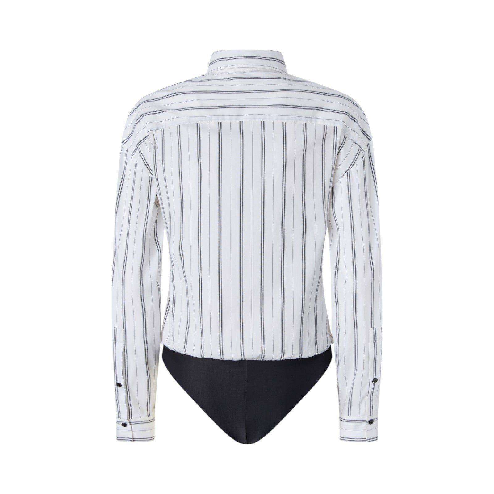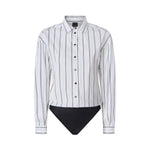 Camicia a maniche lunghe con colletto classico e chiusura frontale con bottoni, caratterizzata da una stampa a righe verticali che slancia la figura. La parte inferiore è realizzata come un body in tessuto stretch, pensato per garantire una vestibilità impeccabile e rimanere perfettamente in posizione.