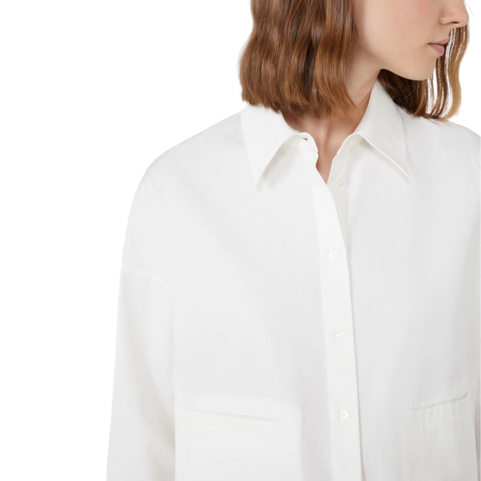 Camicia in popeline di puro cotone pesante. Classico colletto a punta. Maniche lunghe a giro basso con polsino e bottone. Chiusura frontale con bottoni a vista. Tasche a filetto orizzontale sul davanti. La modella veste la taglia 40 (IT) ed è alta 179 cm. Le sue misure sono: vita 60 cm e fianchi 89 cm