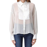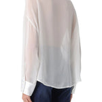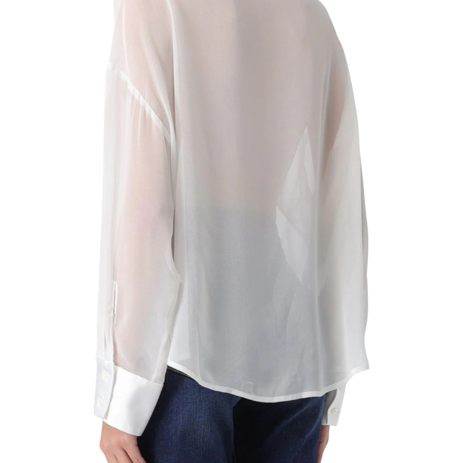 Camicia a maniche lunghe d'ispirazione classica, con colletto a punta, polsini e inserto rettangolare sull'abbottonatura. Il modello regala un delicato gioco di trasparenze grazie alla combinazione di tessuto georgette dal finish velato e di raffinato satin. Il dettaglio che fa la differenza è però il piccolo cut-out creato dal colletto dietro al collo.
