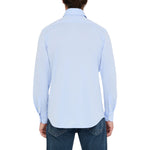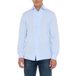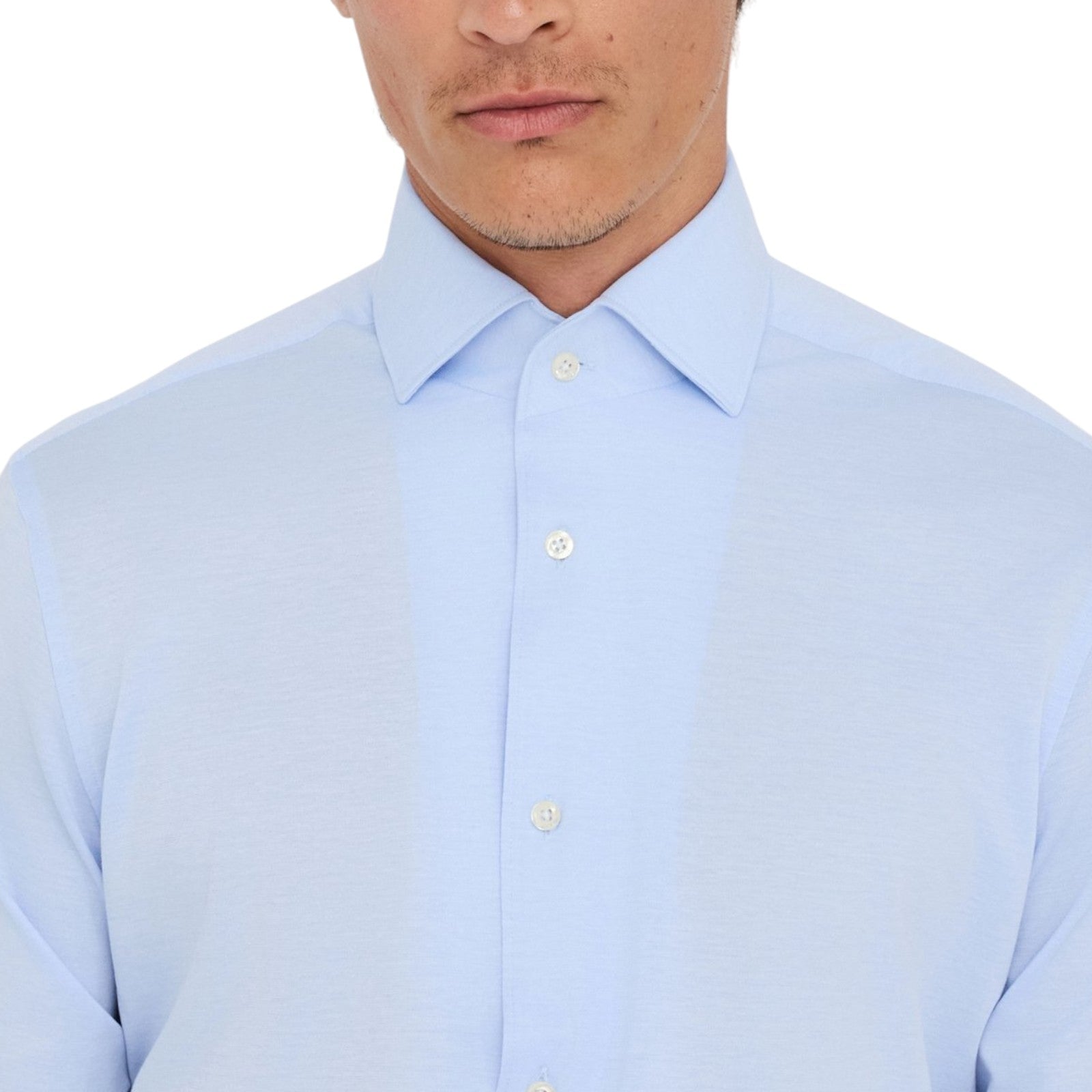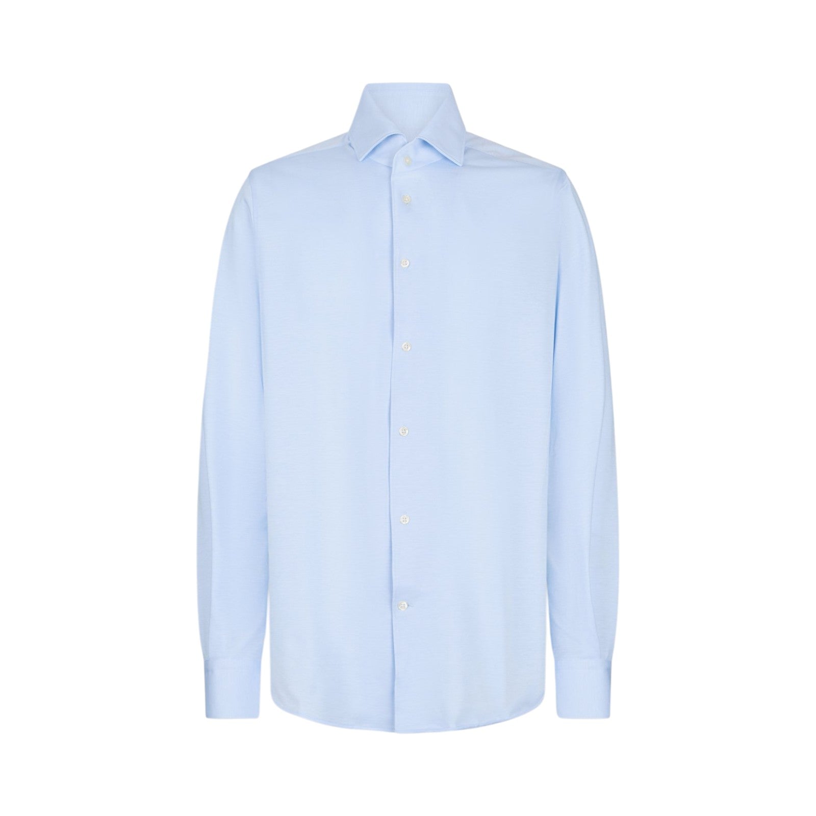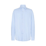 Camicia azzurra. Realizzata in misto cotone. Colletto alla francese. Maniche lunghe. Polsi con bottoni. Chiusura con bottoni.