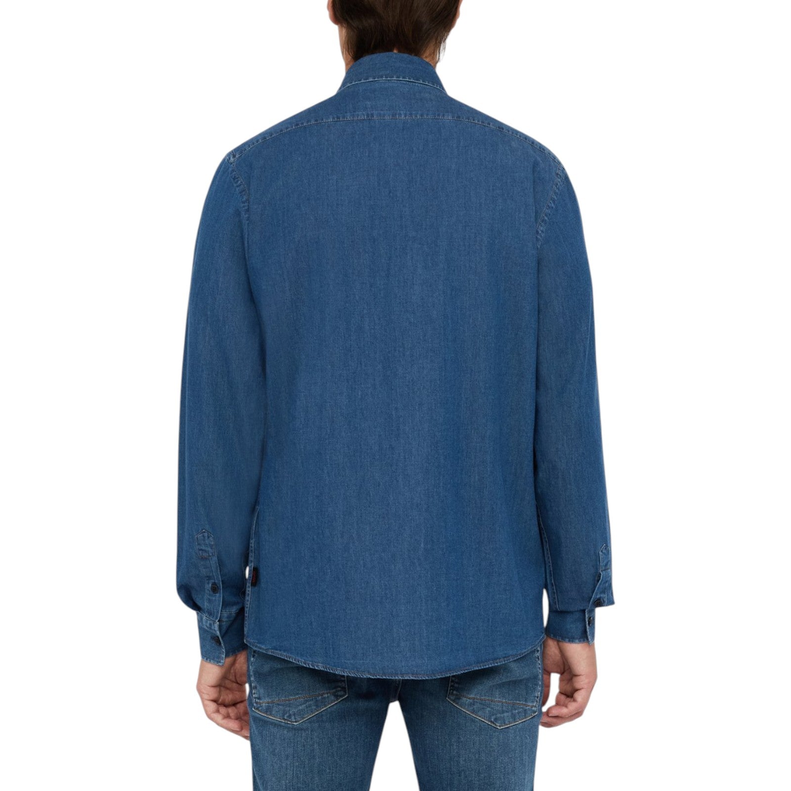 Camicia in denim di cotone. Colletto classico. Maniche lunghe. Polsi con bottoni. Patch logata sul retro. Chiusura con bottoni.
