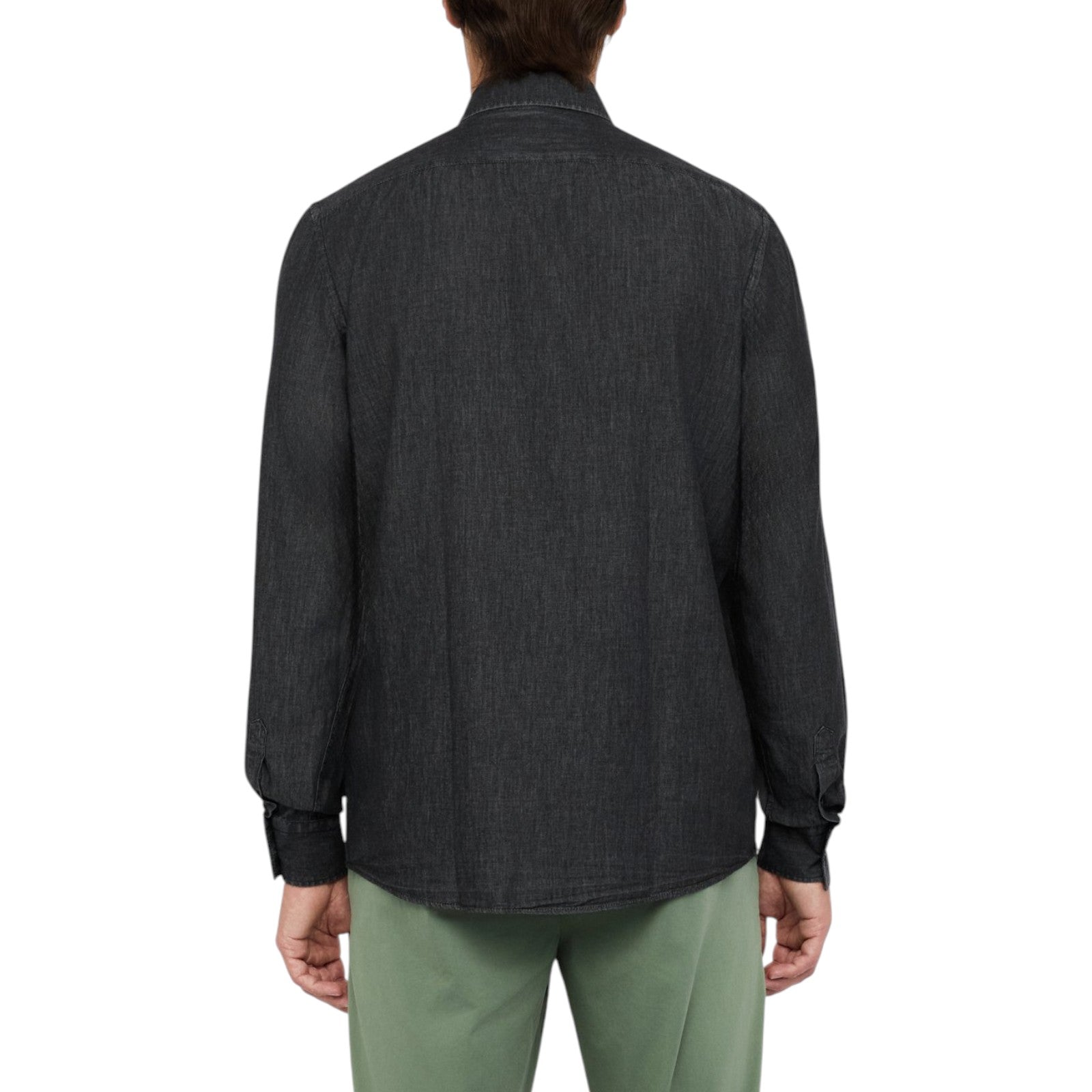 Camicia in denim di cotone. Colletto classico. Maniche lunghe. Polsi con bottoni. Patch logata sul retro. Chiusura con bottoni.
