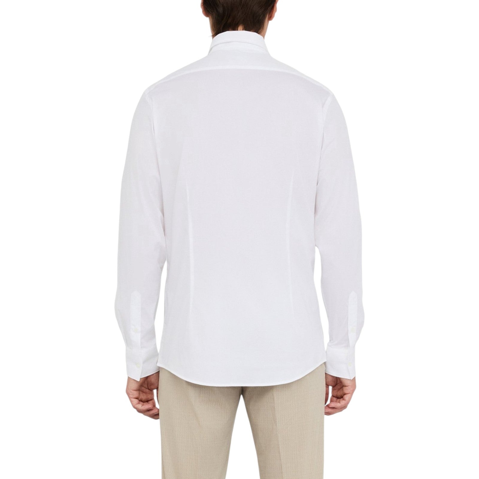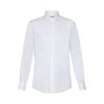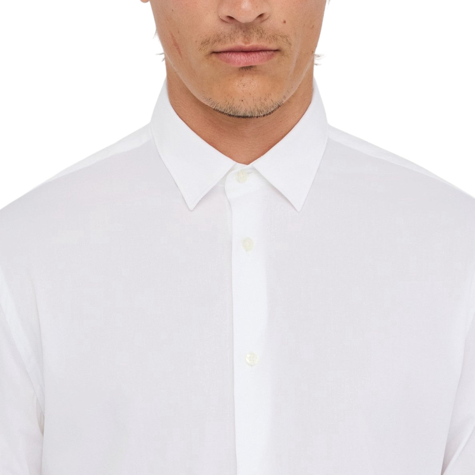 Camicia bianca. Realizzata in cotone stretch. Vestibilità slim. Colletto alla francese. Maniche lunghe. Polsi con bottoni. Chiusura con bottoni.