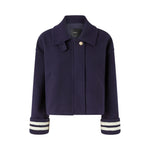 Cappotto caban corto con maniche lunghe e collo stile camicia dotato di asola. Il tessuto utilizzato è un panno di lana extrafine dall'interessante aspetto mosso, simile alla lana cotta, ottenuto tramite bollitura. Il modello propone una rilettura in puro stile PINKO del classico caban, e si distingue per le particolari fettucce sui polsi in mohair agugliato che creano le righe tipiche dei cappotti marinari. La chiusura è nascosta con primo bottone visibile decorato da stella e ispirato all'irregolarità delle madreperle naturali. Il capospalla tecnico è inoltre provvisto di coulisse regolabile inserita in vita, da stringere per personalizzare la portata del capo, e di fodera interna.