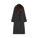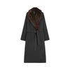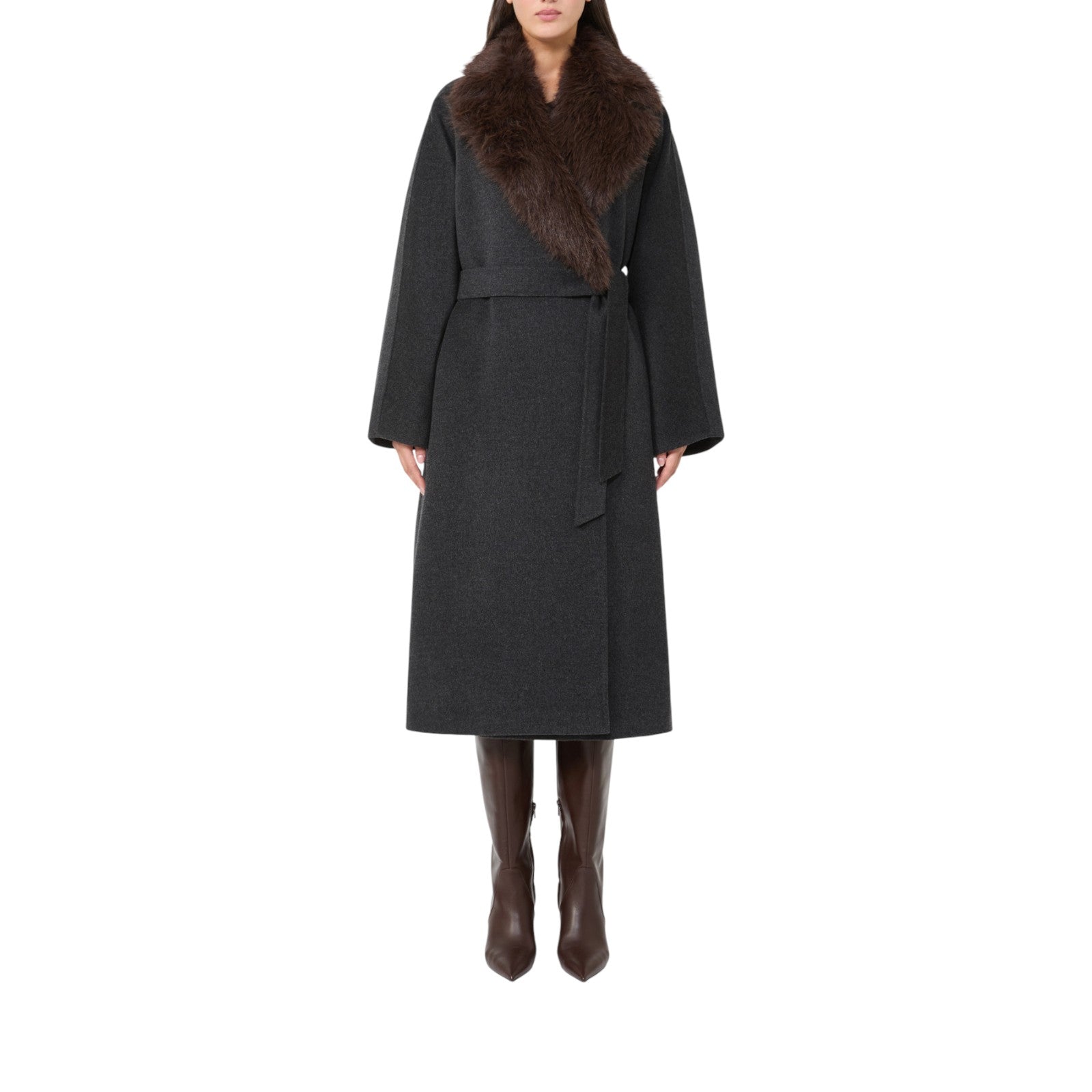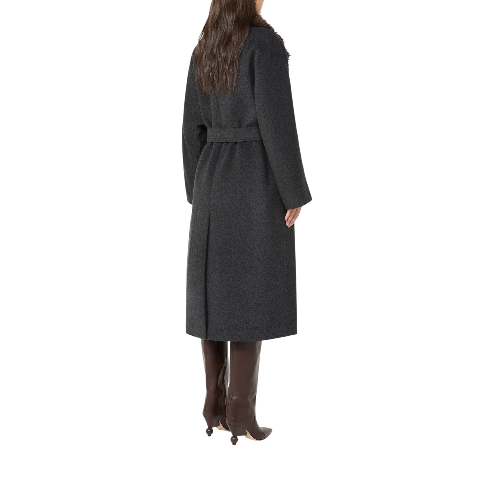Cappotto in tessuto double di mista lana, cucito a mano. Linea dritta con spacco centrale sul retro. Collo a rever ampio. Maniche lunghe a kimono. Chiusura doppiopetto con bottoni in vita e cintura abbinata. Tasche inserite nei fianchi. Foderato, rifinito con puntino sartoriale.