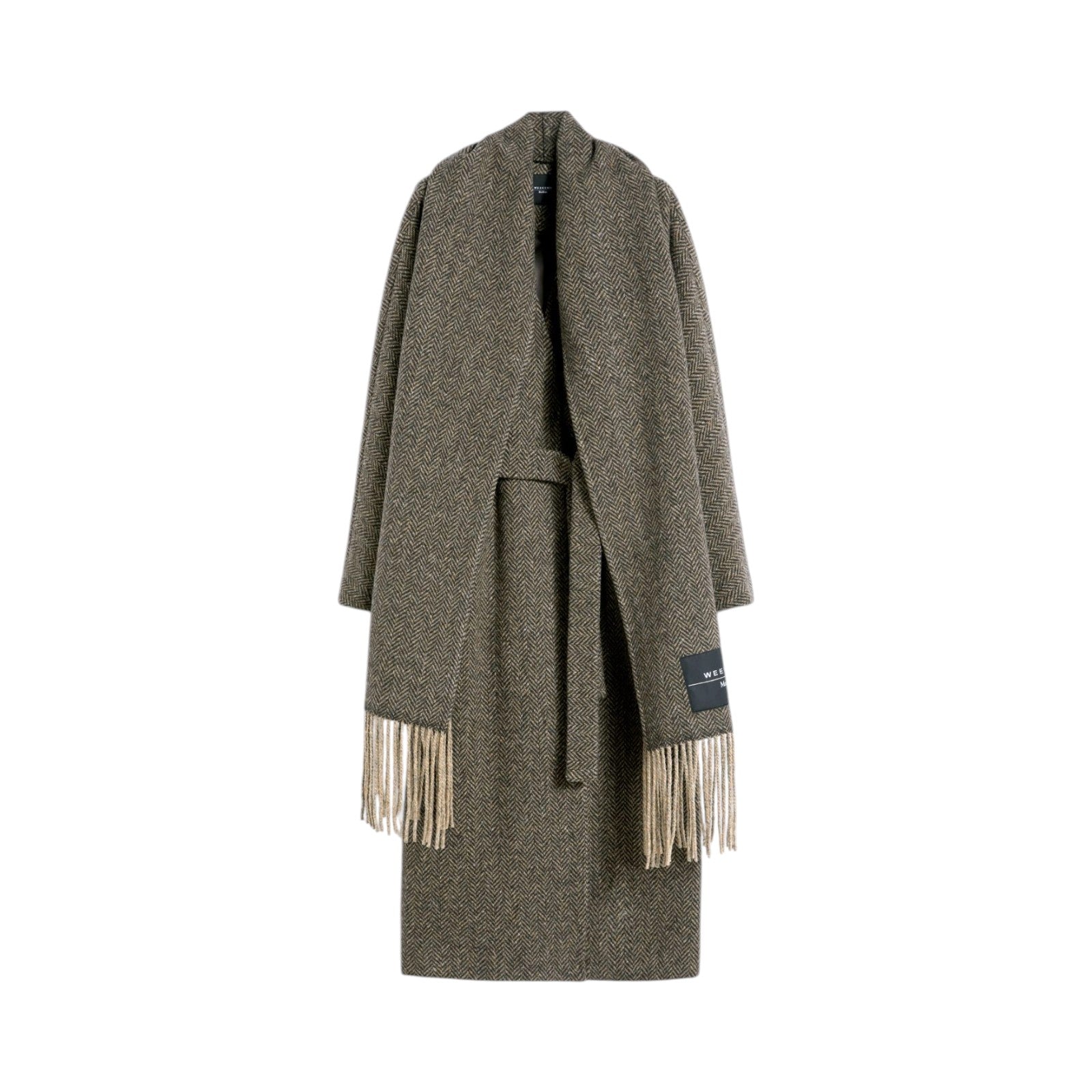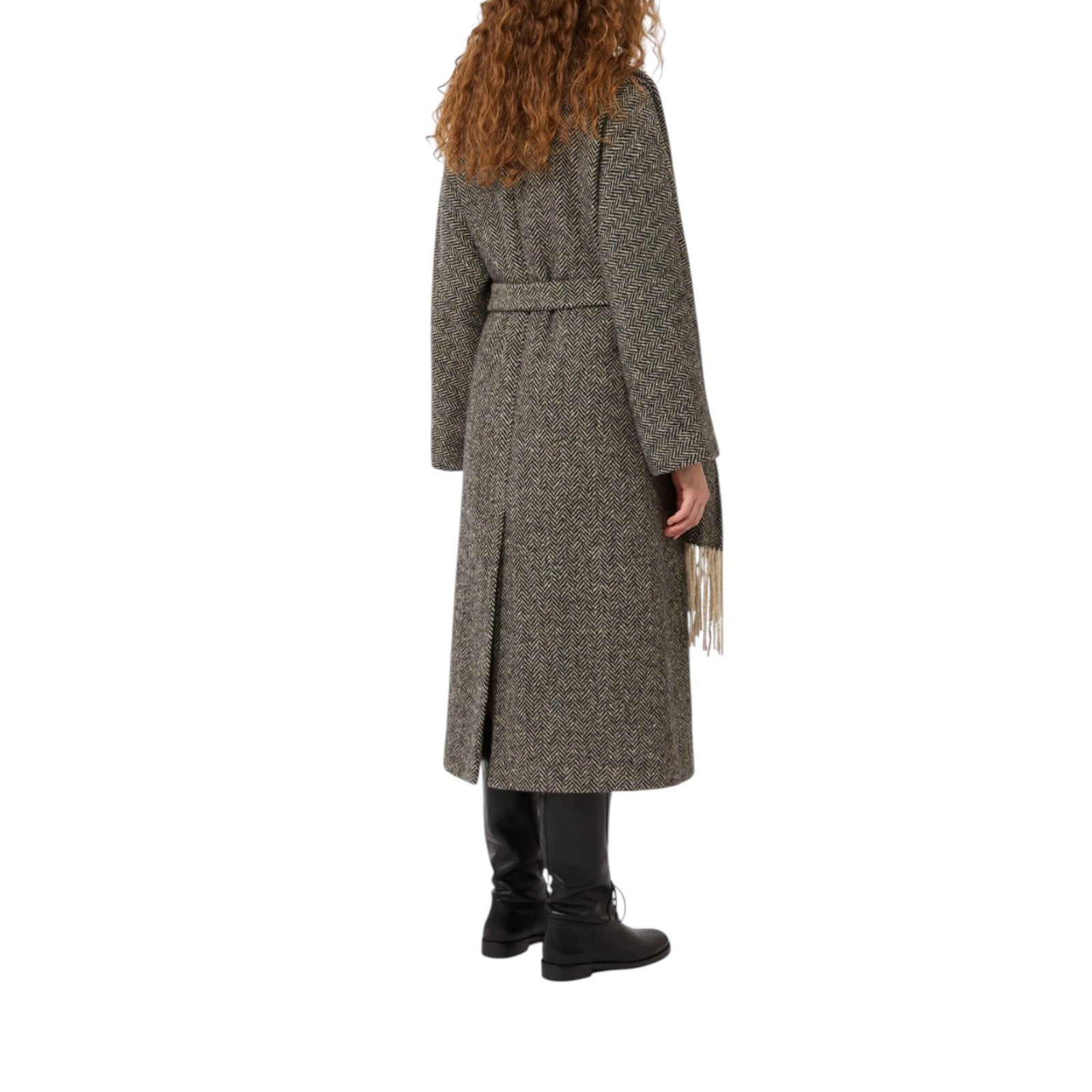 Cappotto in tweed di lana con disegno Chevron. Linea dritta con spacco centrale sul retro. Scollo a V incrociato. Maniche lunghe a kimono. Chiusura con cintura abbinata in vita. Tasche a filettone sui fianchi. Semifoderato.