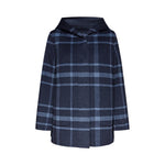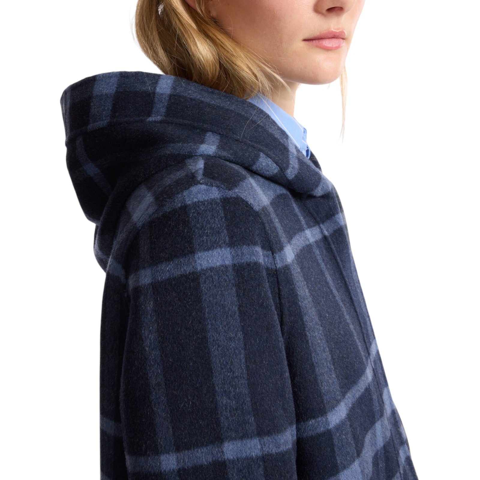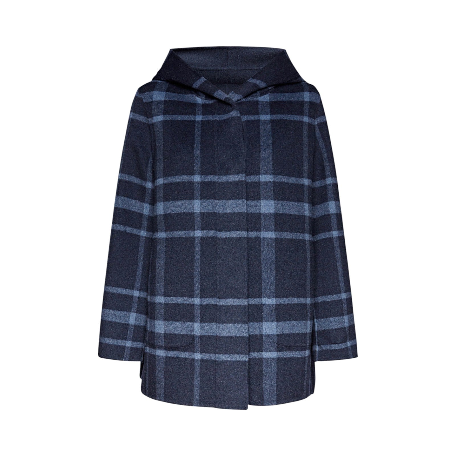 Cappotto leggero dall'attitudine sportiva in tessuto checks, con cappuccio, linea leggermente svasata. Tasche con impunture, chiusura con automatici cuciti a mano. Sfoderato.
