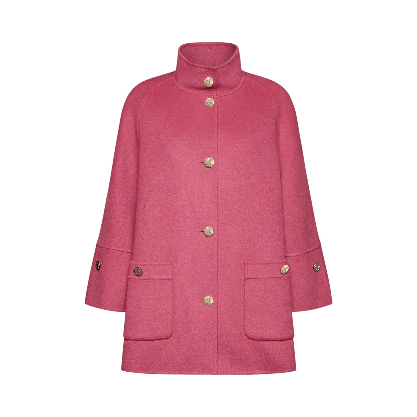 Cappotto corto in pregiato tessuto double, con bottoni Monogram, sfoderato. Taglio raglan per le maniche, collo a listino alto e grandi tasche a toppa. Spacchi sul fondo della manica con bottone Monogram e fondo capo motivo stondato sui fianchi.