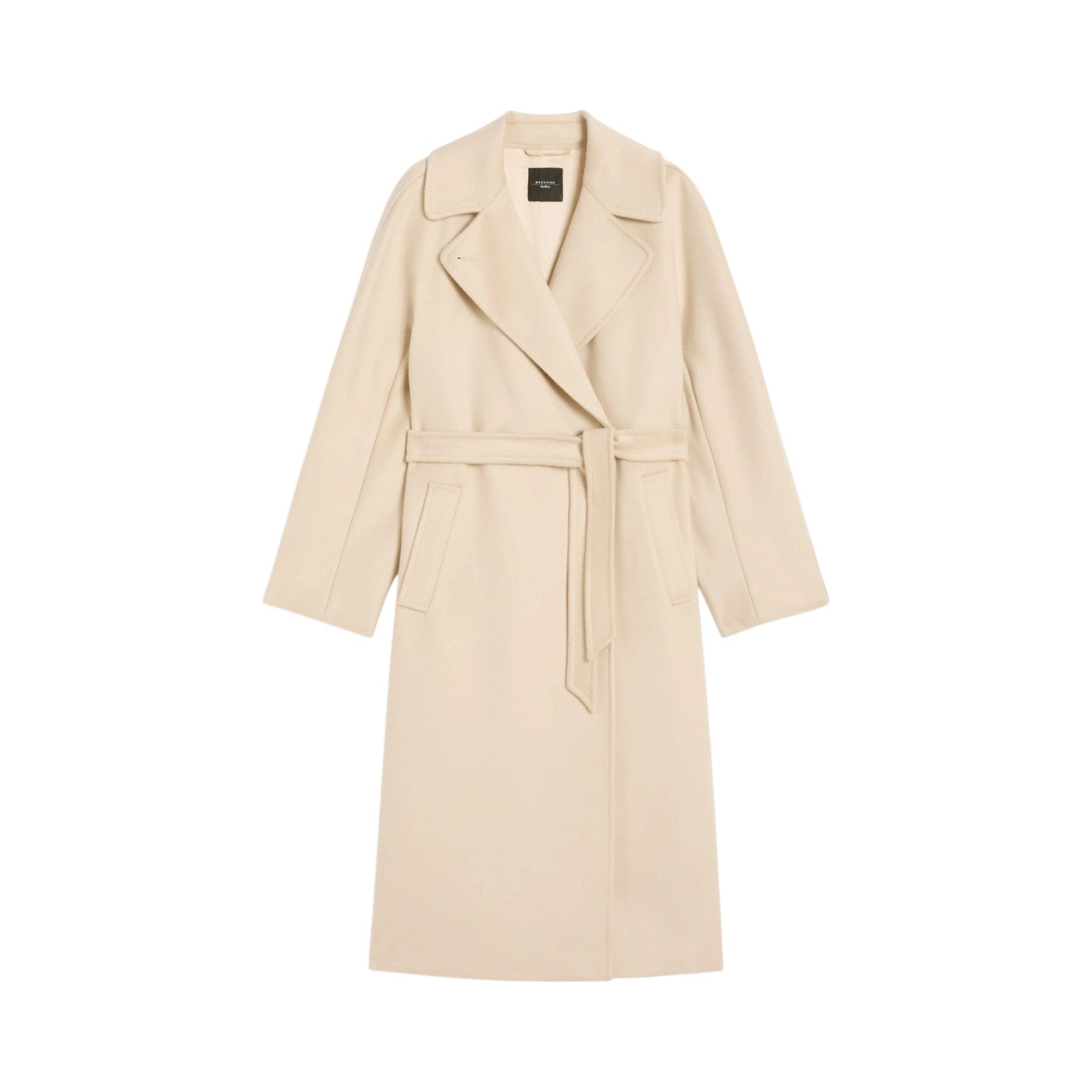 Cappotto in drap di pura lana. Linea dritta. Collo a rever ampio. Maniche lunghe a kimono. Chiusura con bottoni. Tasche a filettone sui fianchi. Foderato.