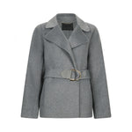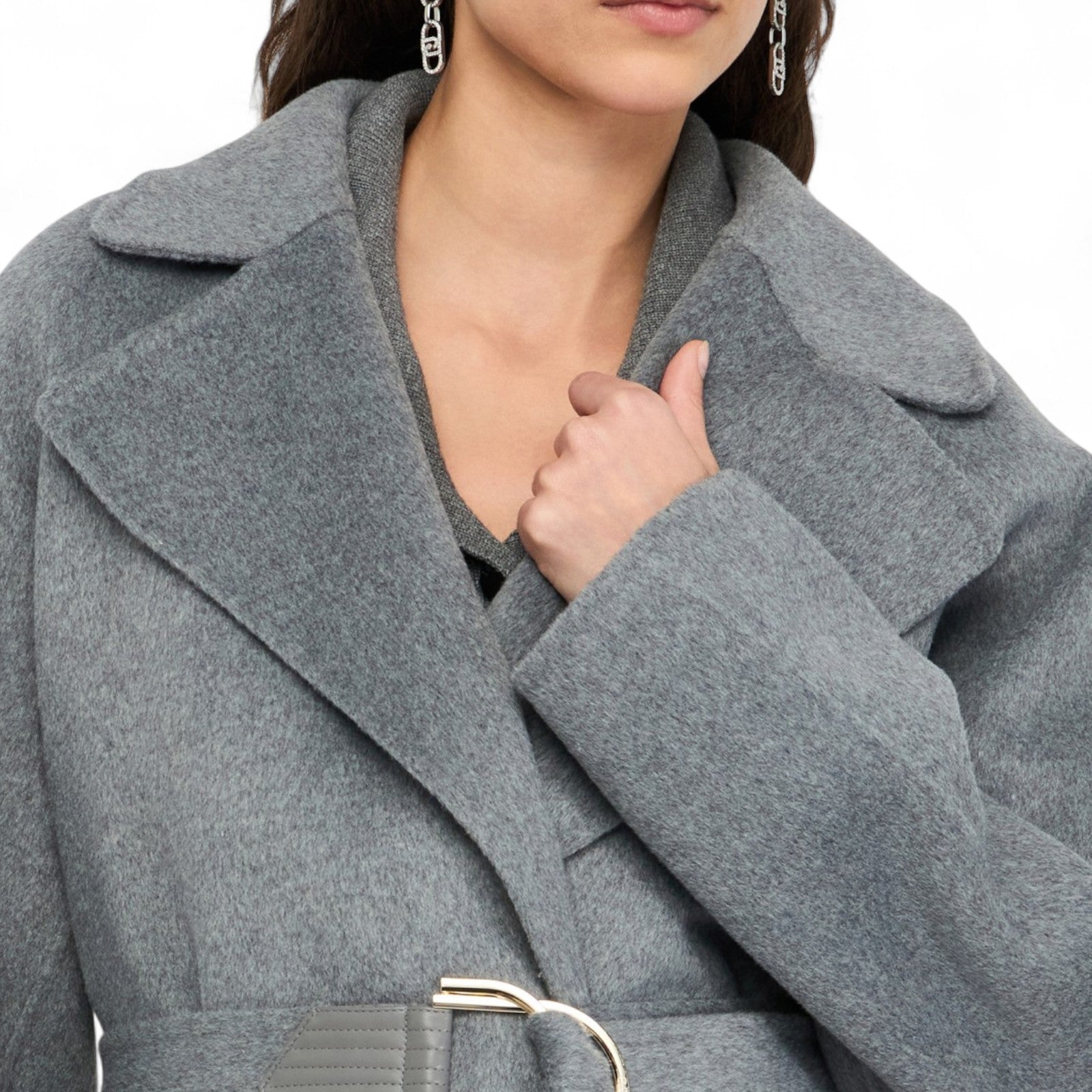 Cappotto grigio. Realizzato in panno di misto lana. Collo a revers. Tasche sui lati. Cintura sur ton con fibbia d-ring in abbinamento. Chiusura doppiopetto. Fodera interna.